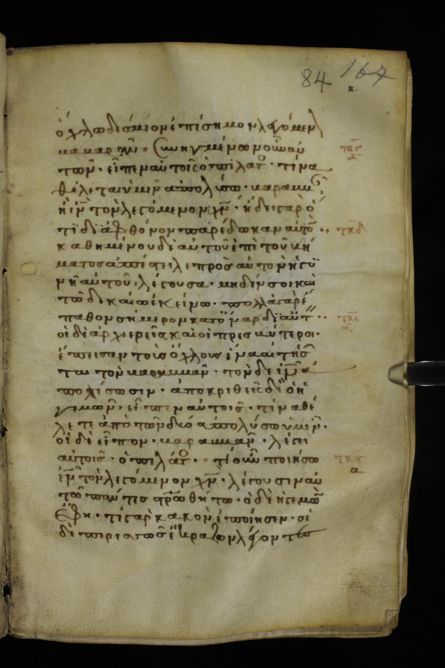 Thirteenth century minuscule of the Gospels on parchment; 298 leaves, 1 column, 22-24 lines per column. Images were taken at the National Library of Greece in Athens.