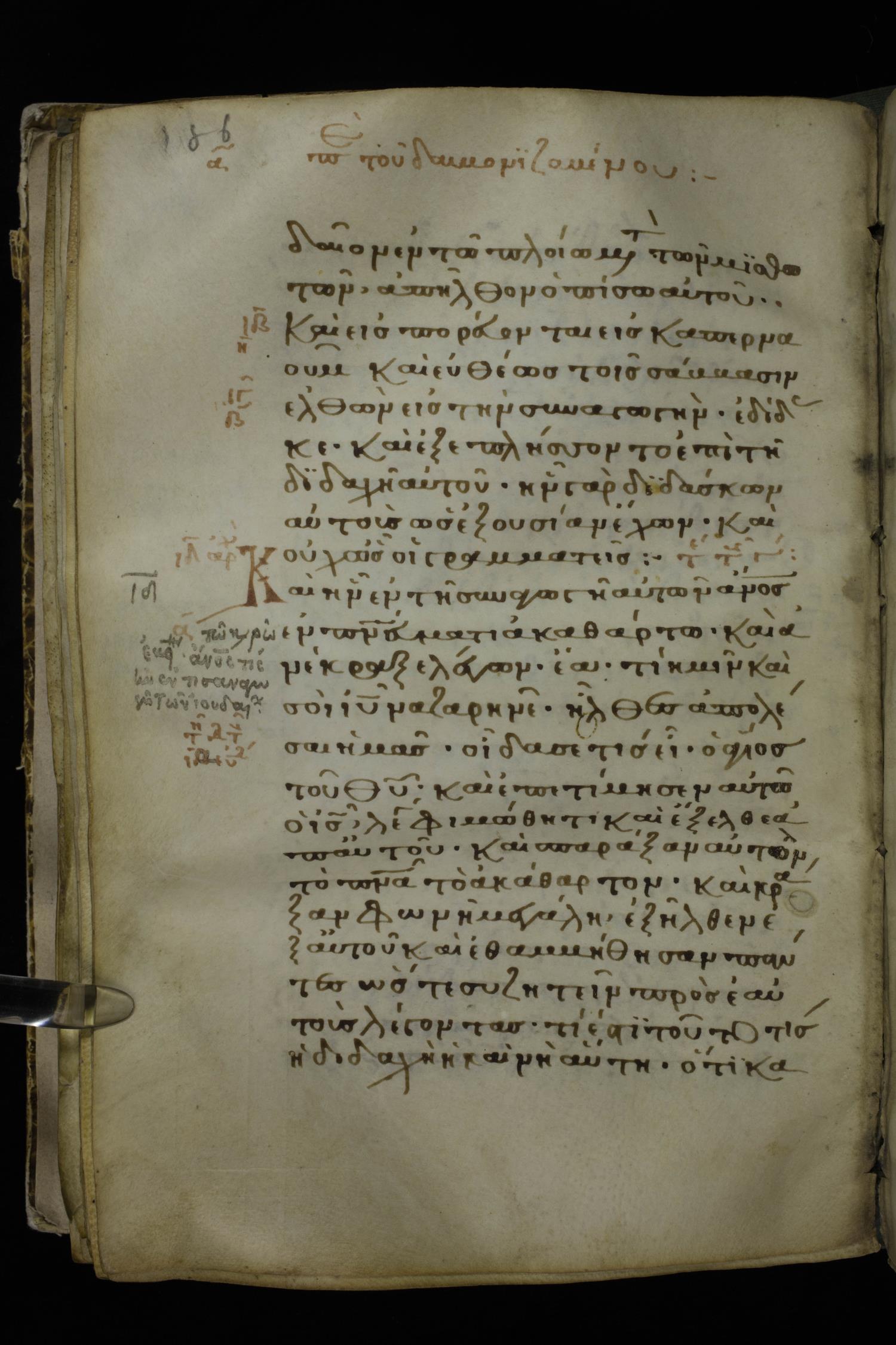Thirteenth century minuscule of the Gospels on parchment; 298 leaves, 1 column, 22-24 lines per column. Images were taken at the National Library of Greece in Athens.
