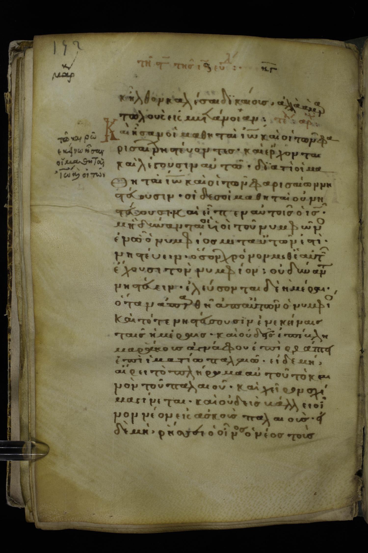 Thirteenth century minuscule of the Gospels on parchment; 298 leaves, 1 column, 22-24 lines per column. Images were taken at the National Library of Greece in Athens.