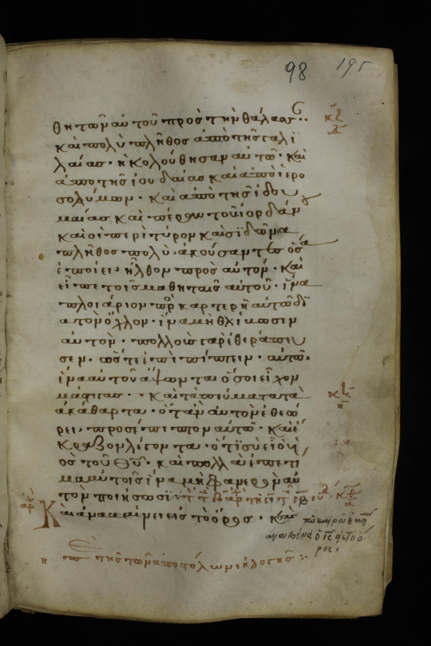Thirteenth century minuscule of the Gospels on parchment; 298 leaves, 1 column, 22-24 lines per column. Images were taken at the National Library of Greece in Athens.