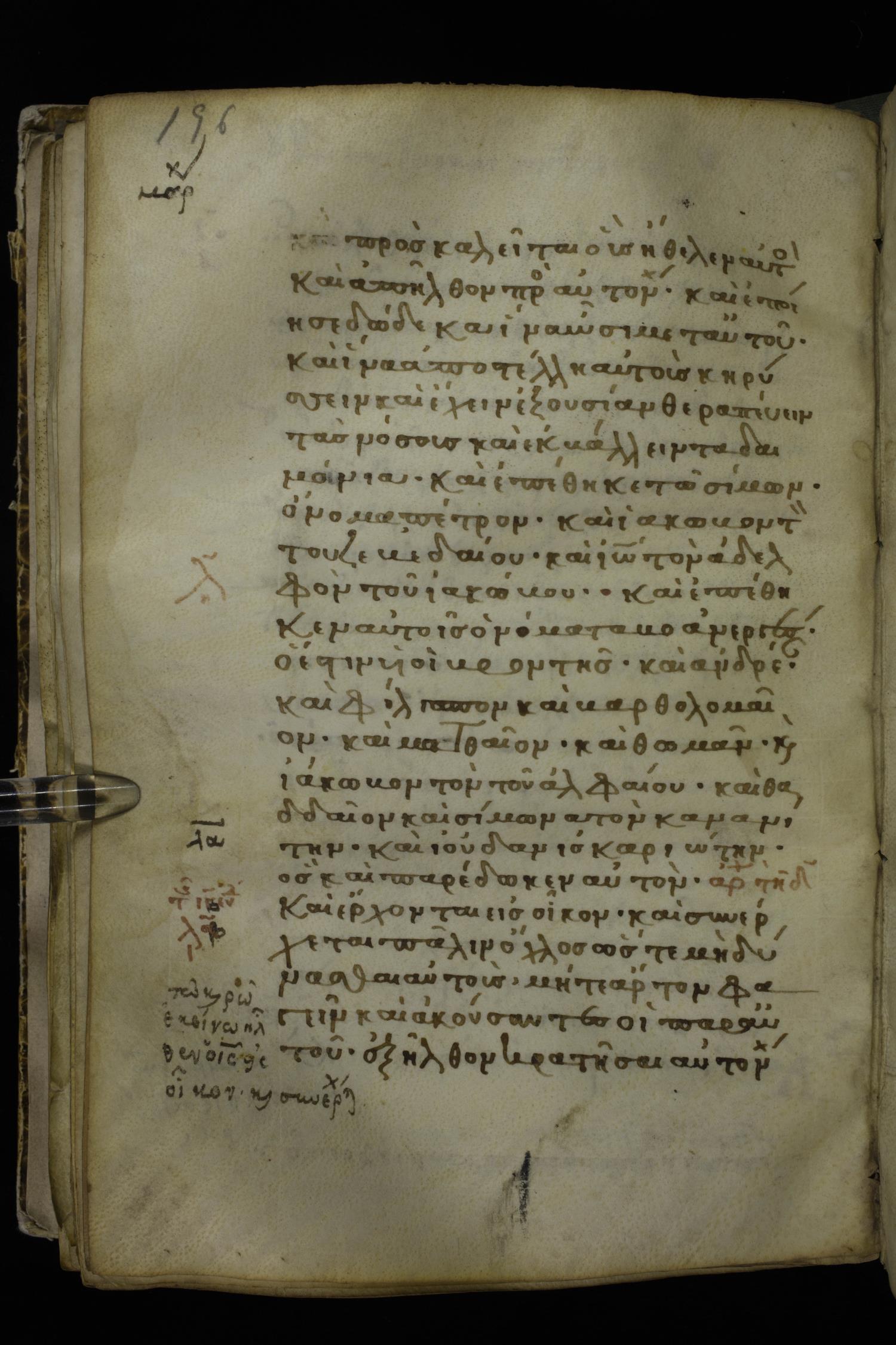 Thirteenth century minuscule of the Gospels on parchment; 298 leaves, 1 column, 22-24 lines per column. Images were taken at the National Library of Greece in Athens.