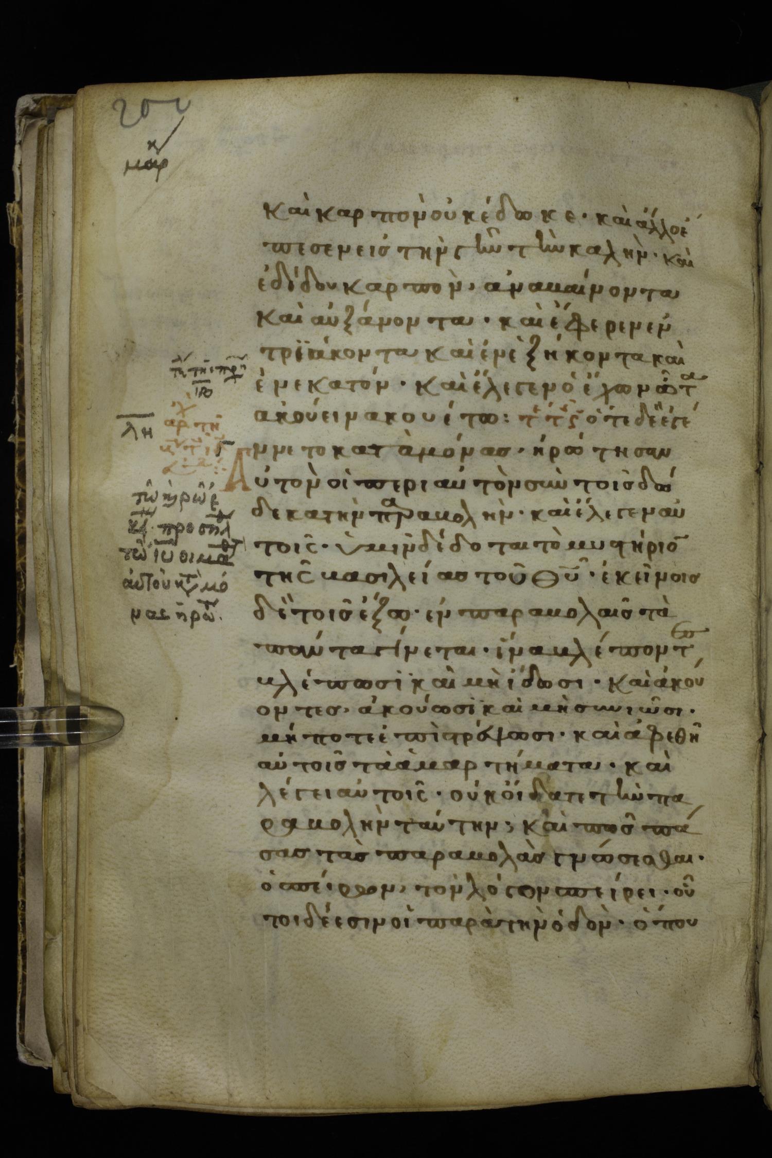 Thirteenth century minuscule of the Gospels on parchment; 298 leaves, 1 column, 22-24 lines per column. Images were taken at the National Library of Greece in Athens.