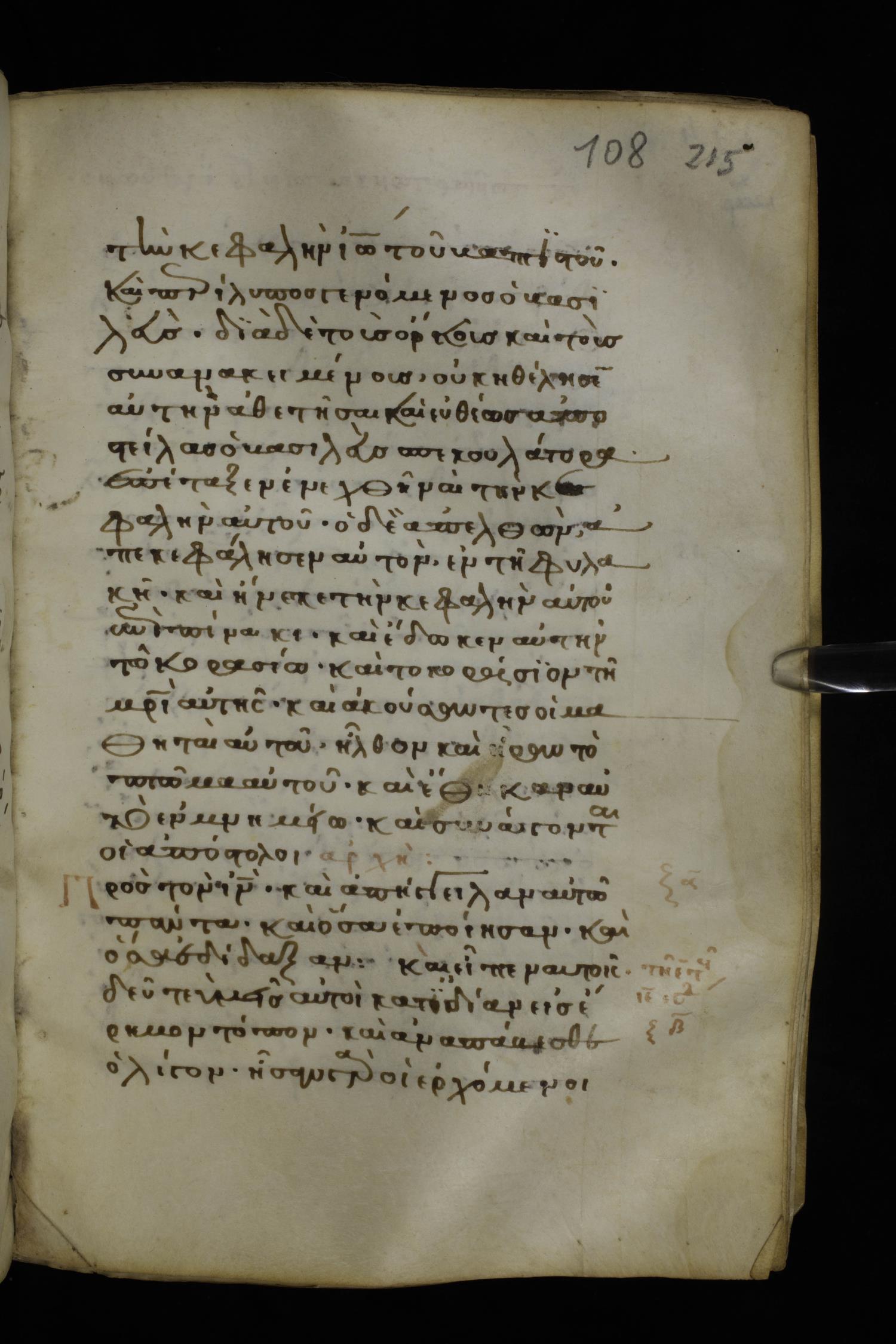Thirteenth century minuscule of the Gospels on parchment; 298 leaves, 1 column, 22-24 lines per column. Images were taken at the National Library of Greece in Athens.