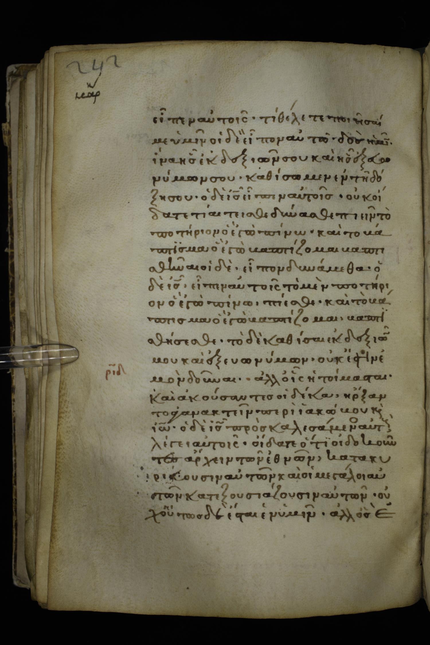 Thirteenth century minuscule of the Gospels on parchment; 298 leaves, 1 column, 22-24 lines per column. Images were taken at the National Library of Greece in Athens.