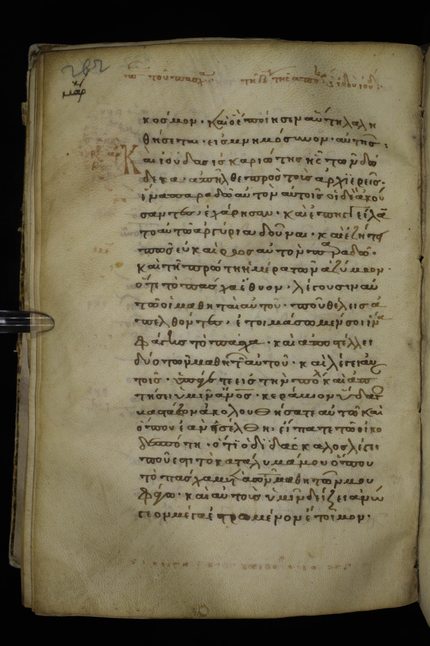 Thirteenth century minuscule of the Gospels on parchment; 298 leaves, 1 column, 22-24 lines per column. Images were taken at the National Library of Greece in Athens.