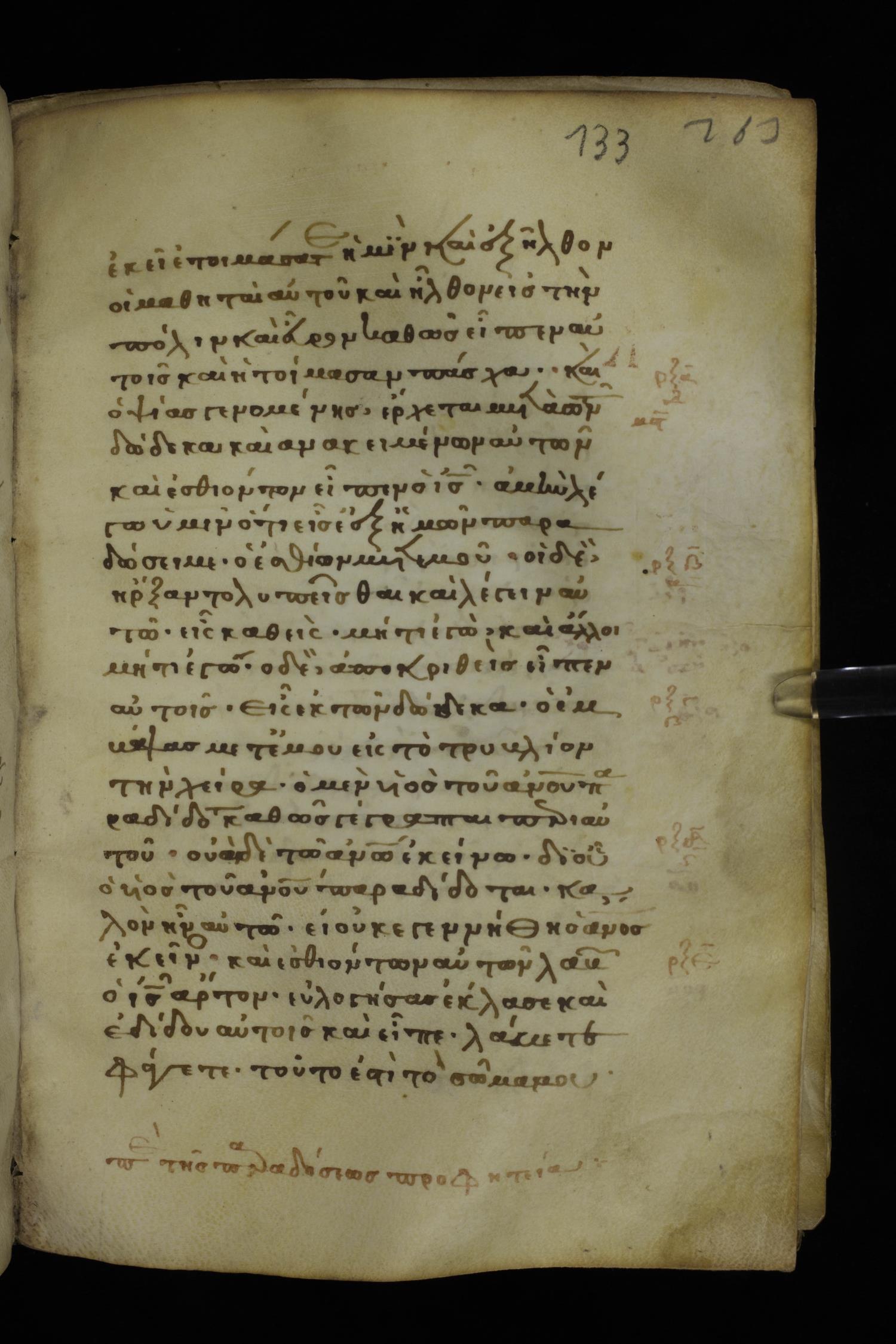 Thirteenth century minuscule of the Gospels on parchment; 298 leaves, 1 column, 22-24 lines per column. Images were taken at the National Library of Greece in Athens.