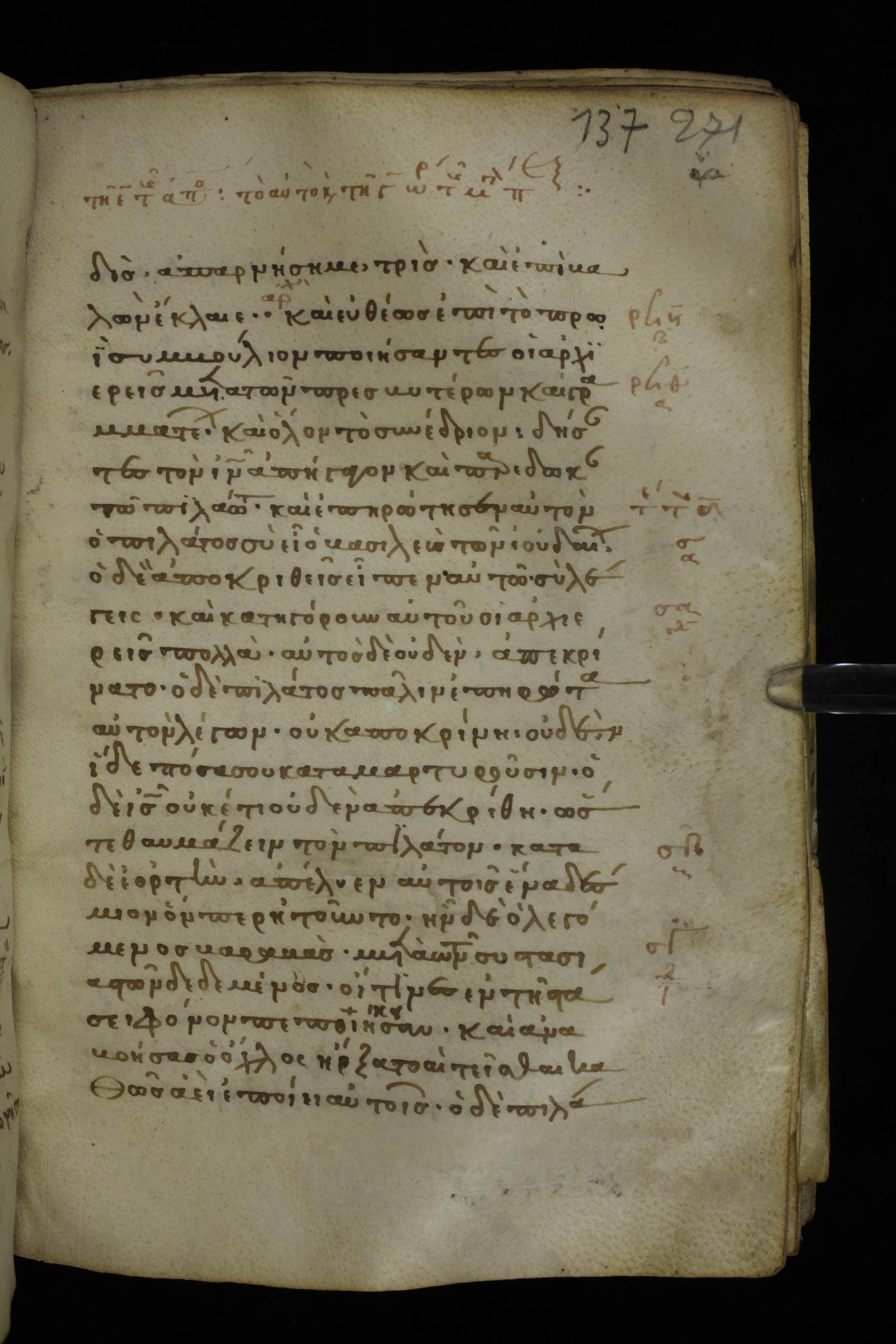 Thirteenth century minuscule of the Gospels on parchment; 298 leaves, 1 column, 22-24 lines per column. Images were taken at the National Library of Greece in Athens.