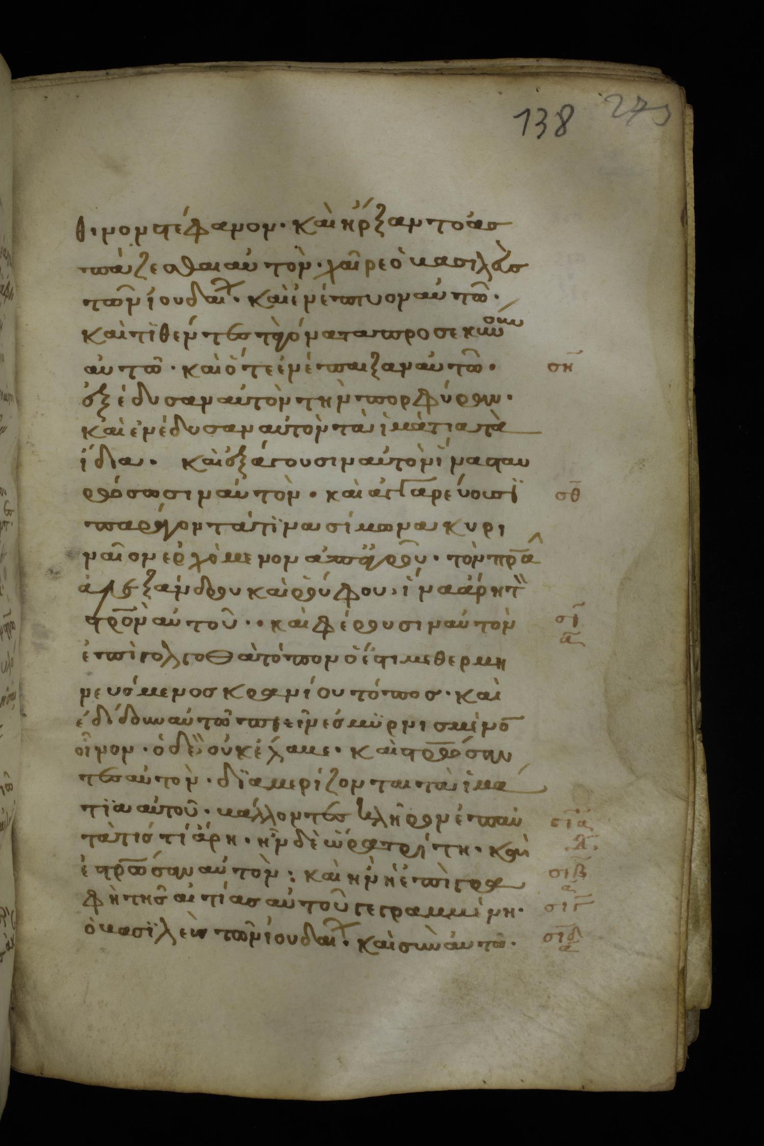 Thirteenth century minuscule of the Gospels on parchment; 298 leaves, 1 column, 22-24 lines per column. Images were taken at the National Library of Greece in Athens.