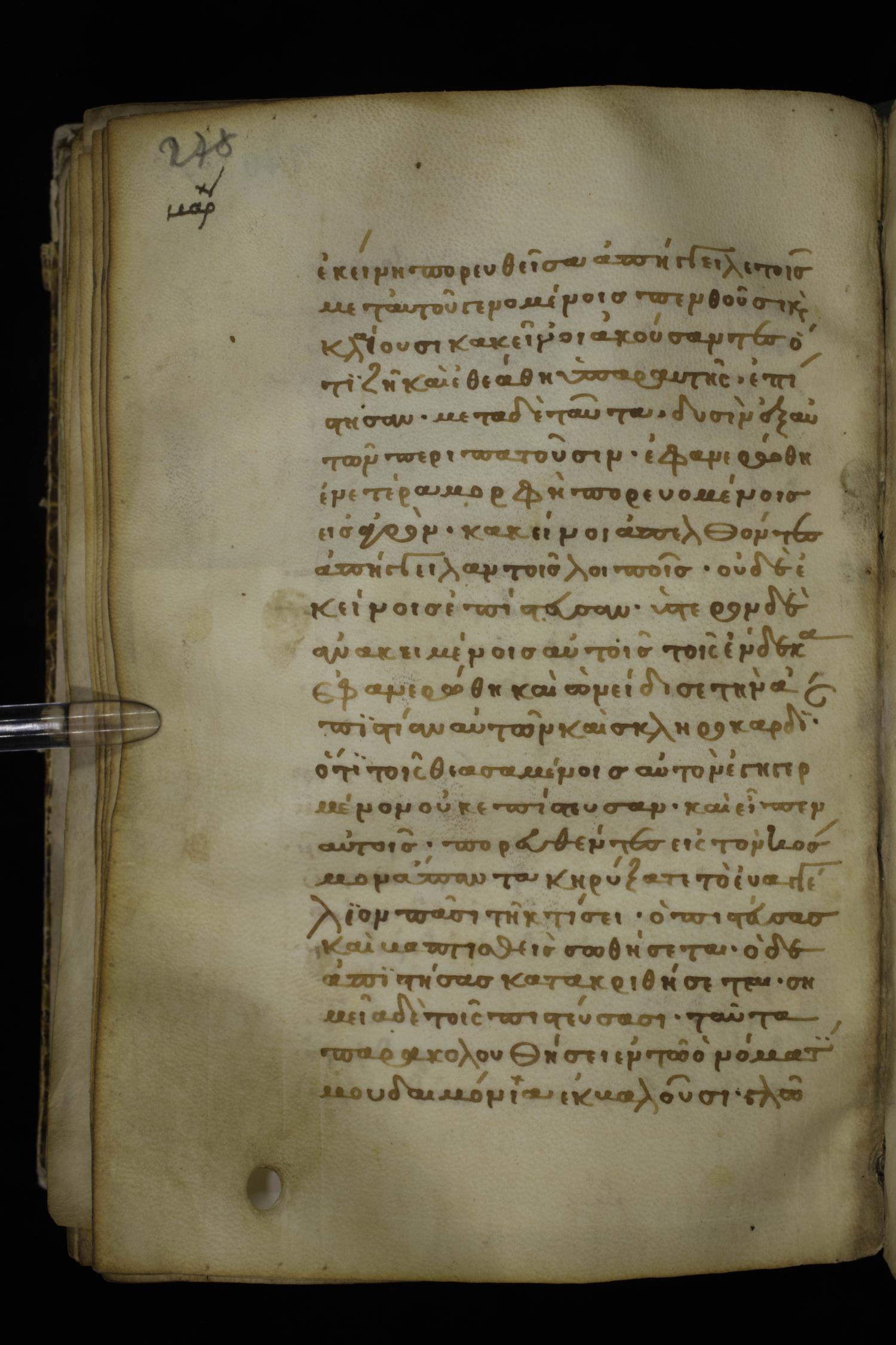 Thirteenth century minuscule of the Gospels on parchment; 298 leaves, 1 column, 22-24 lines per column. Images were taken at the National Library of Greece in Athens.