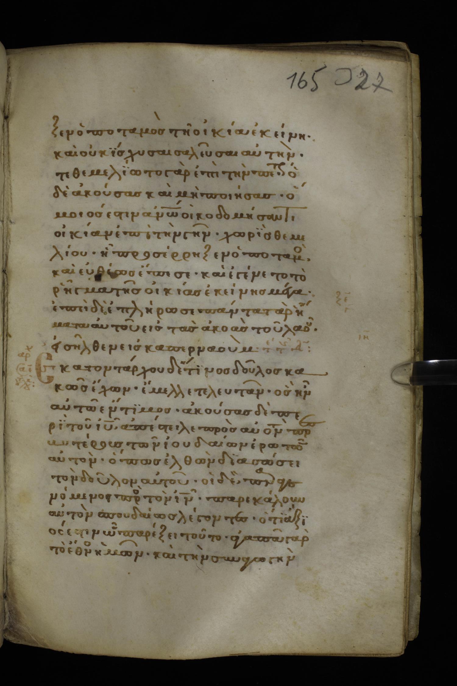 Thirteenth century minuscule of the Gospels on parchment; 298 leaves, 1 column, 22-24 lines per column. Images were taken at the National Library of Greece in Athens.