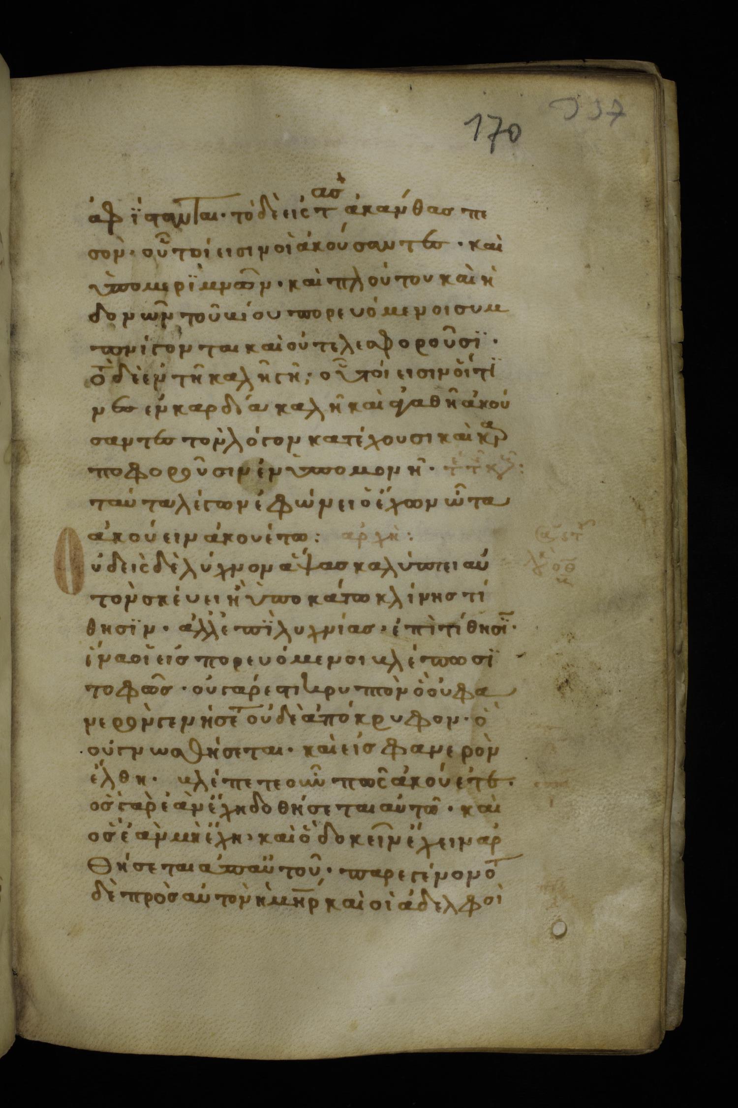 Thirteenth century minuscule of the Gospels on parchment; 298 leaves, 1 column, 22-24 lines per column. Images were taken at the National Library of Greece in Athens.