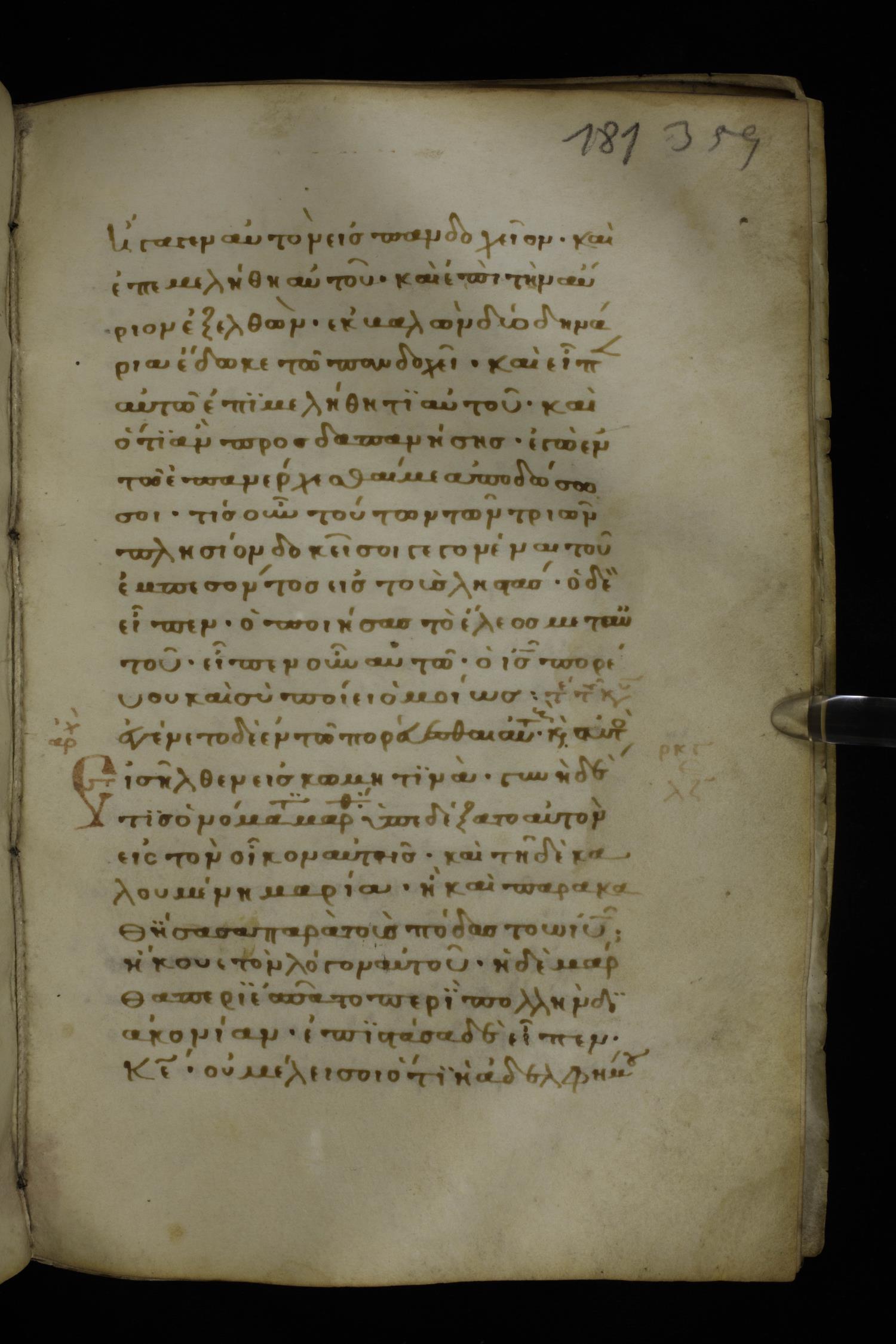 Thirteenth century minuscule of the Gospels on parchment; 298 leaves, 1 column, 22-24 lines per column. Images were taken at the National Library of Greece in Athens.