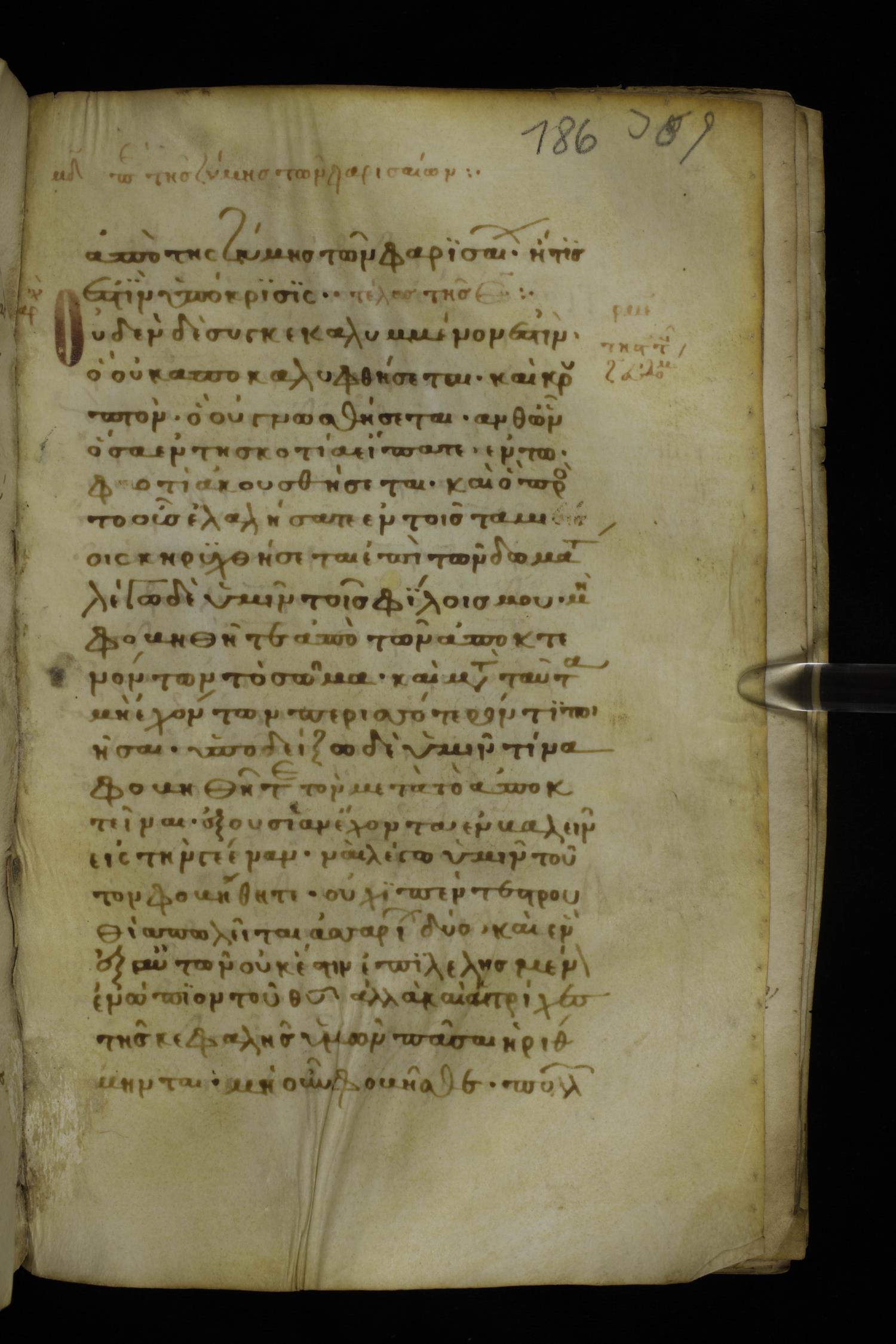 Thirteenth century minuscule of the Gospels on parchment; 298 leaves, 1 column, 22-24 lines per column. Images were taken at the National Library of Greece in Athens.