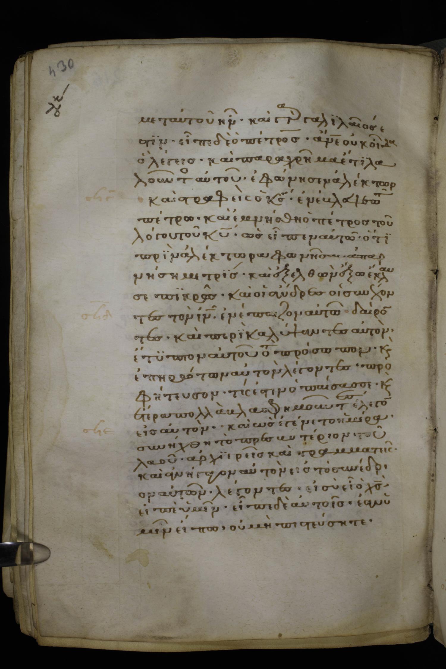 Thirteenth century minuscule of the Gospels on parchment; 298 leaves, 1 column, 22-24 lines per column. Images were taken at the National Library of Greece in Athens.