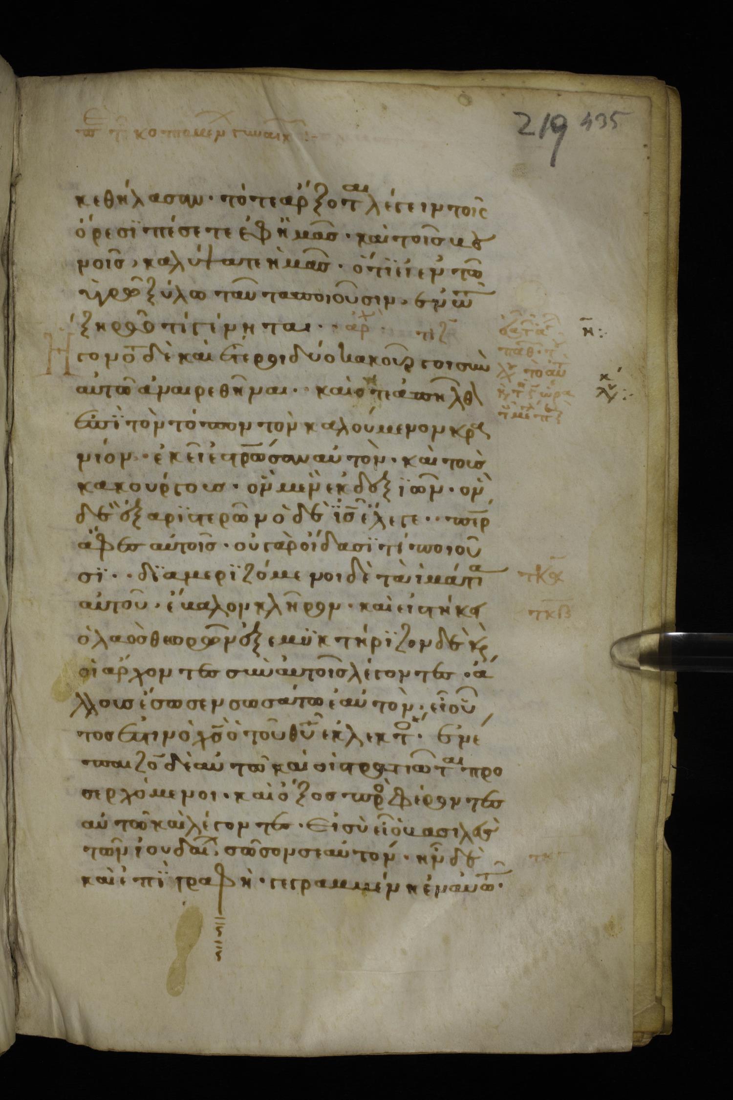 Thirteenth century minuscule of the Gospels on parchment; 298 leaves, 1 column, 22-24 lines per column. Images were taken at the National Library of Greece in Athens.