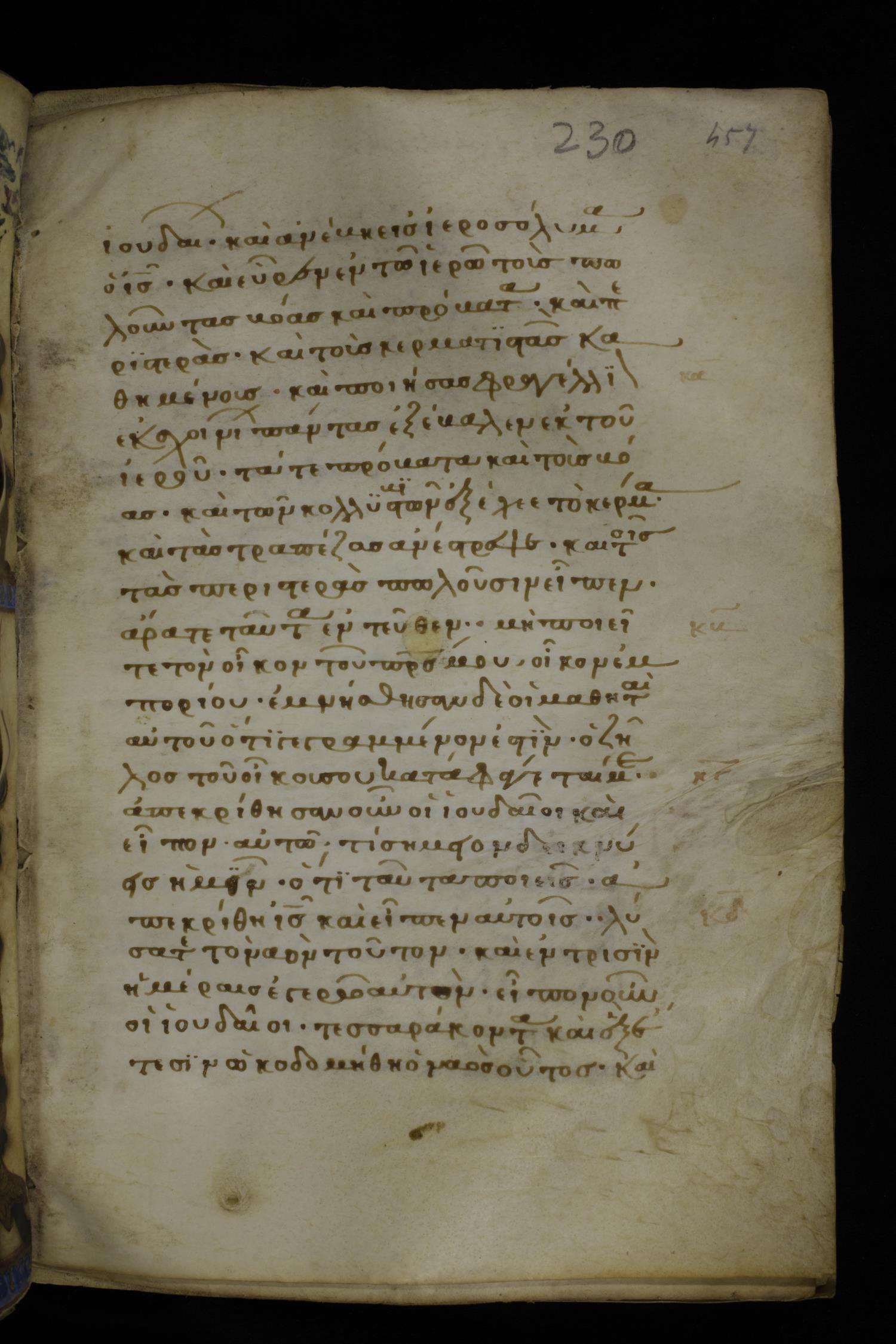 Thirteenth century minuscule of the Gospels on parchment; 298 leaves, 1 column, 22-24 lines per column. Images were taken at the National Library of Greece in Athens.