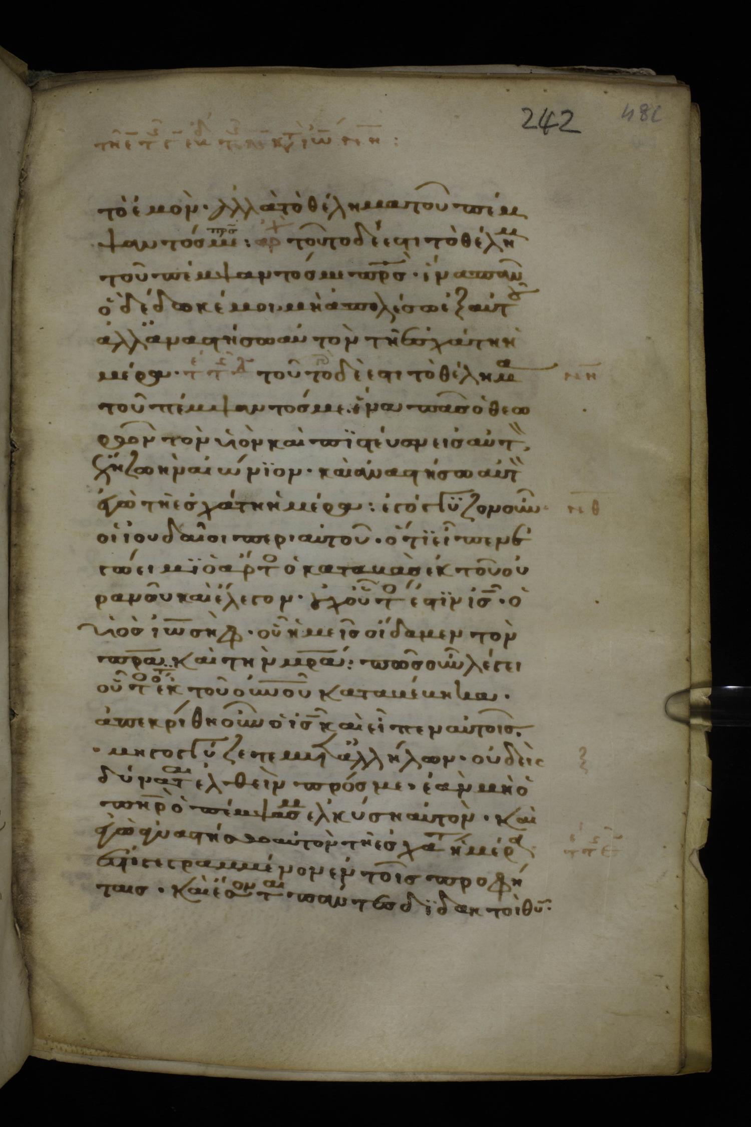 Thirteenth century minuscule of the Gospels on parchment; 298 leaves, 1 column, 22-24 lines per column. Images were taken at the National Library of Greece in Athens.