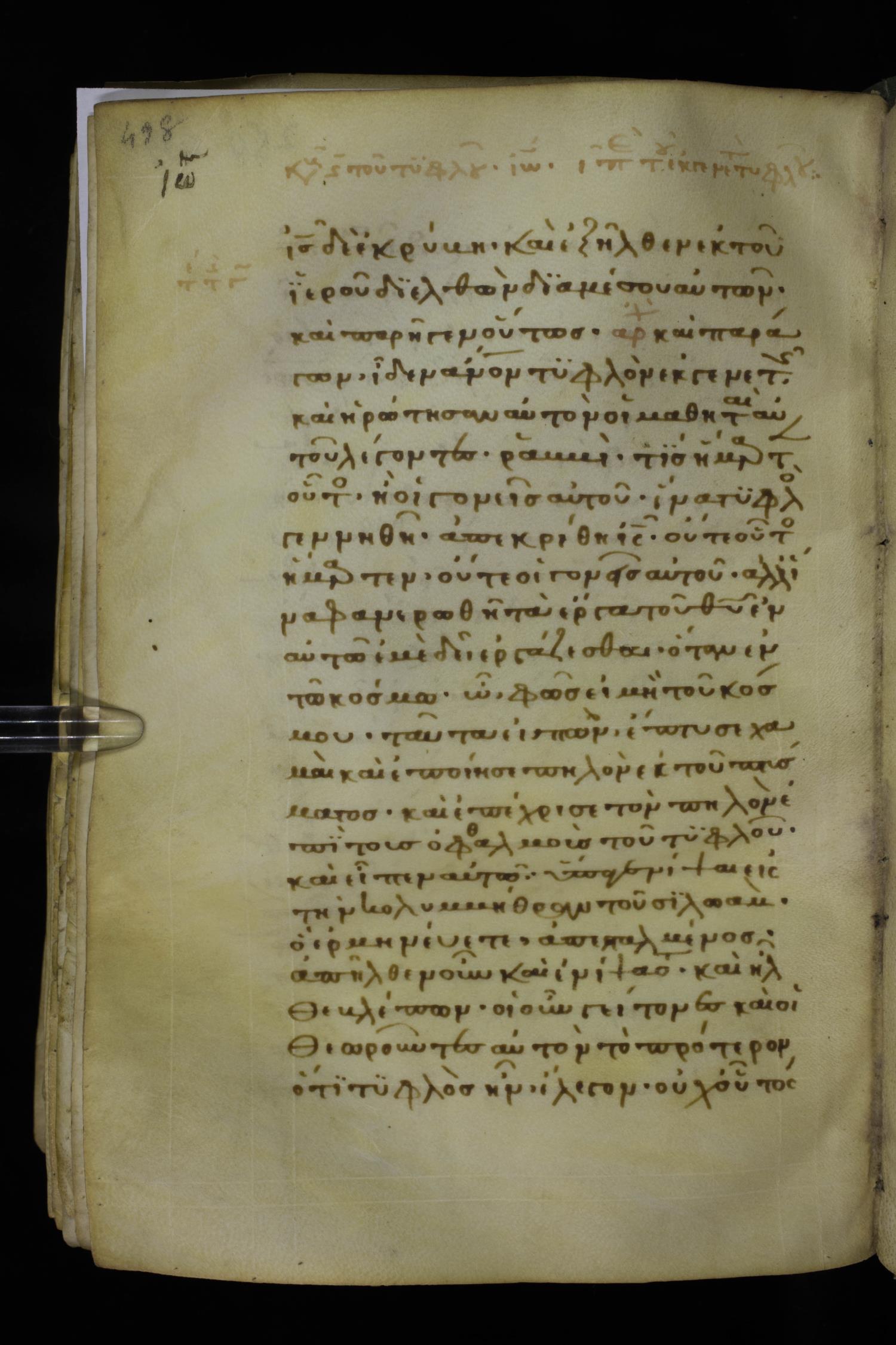 Thirteenth century minuscule of the Gospels on parchment; 298 leaves, 1 column, 22-24 lines per column. Images were taken at the National Library of Greece in Athens.