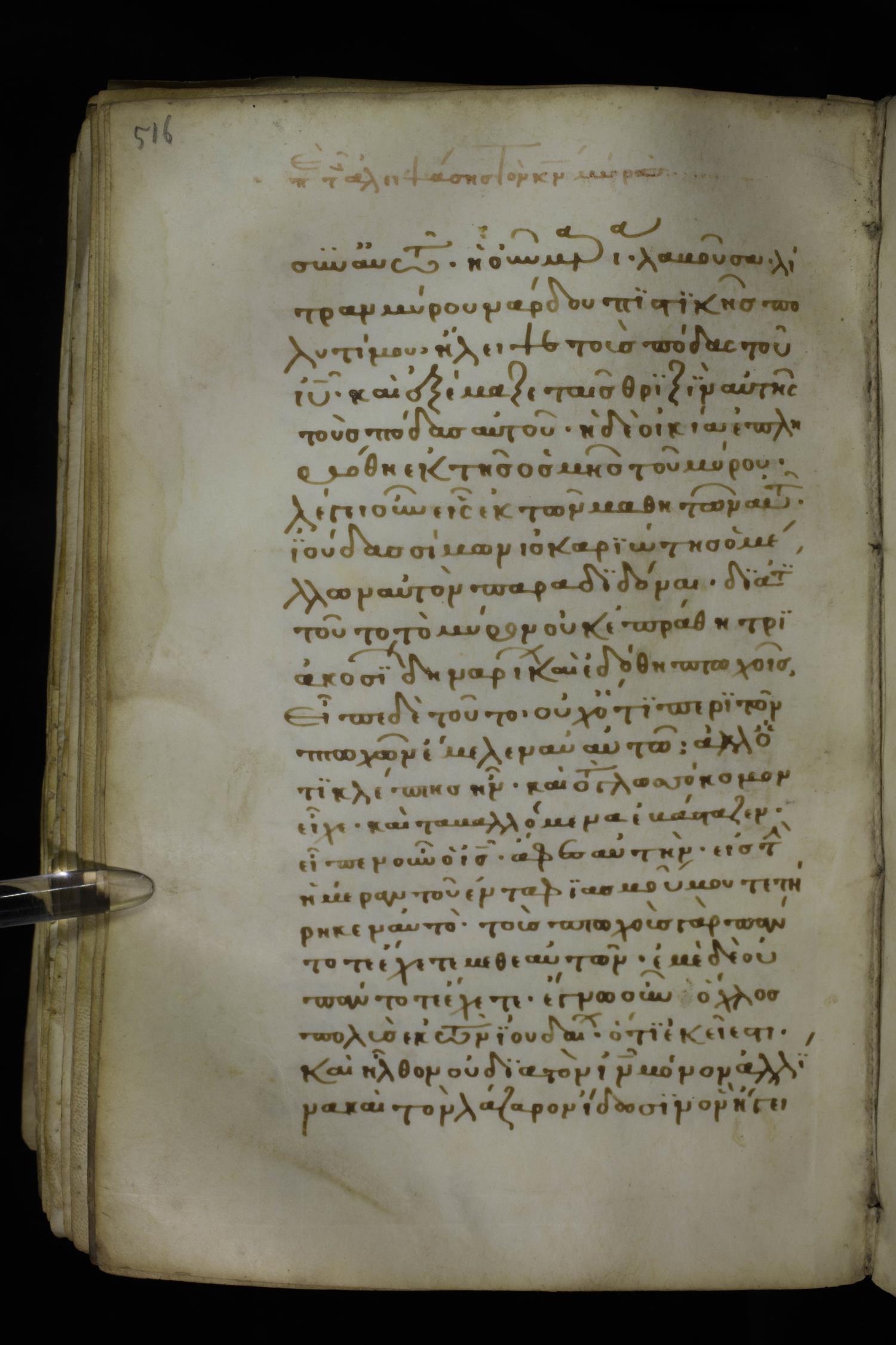 Thirteenth century minuscule of the Gospels on parchment; 298 leaves, 1 column, 22-24 lines per column. Images were taken at the National Library of Greece in Athens.