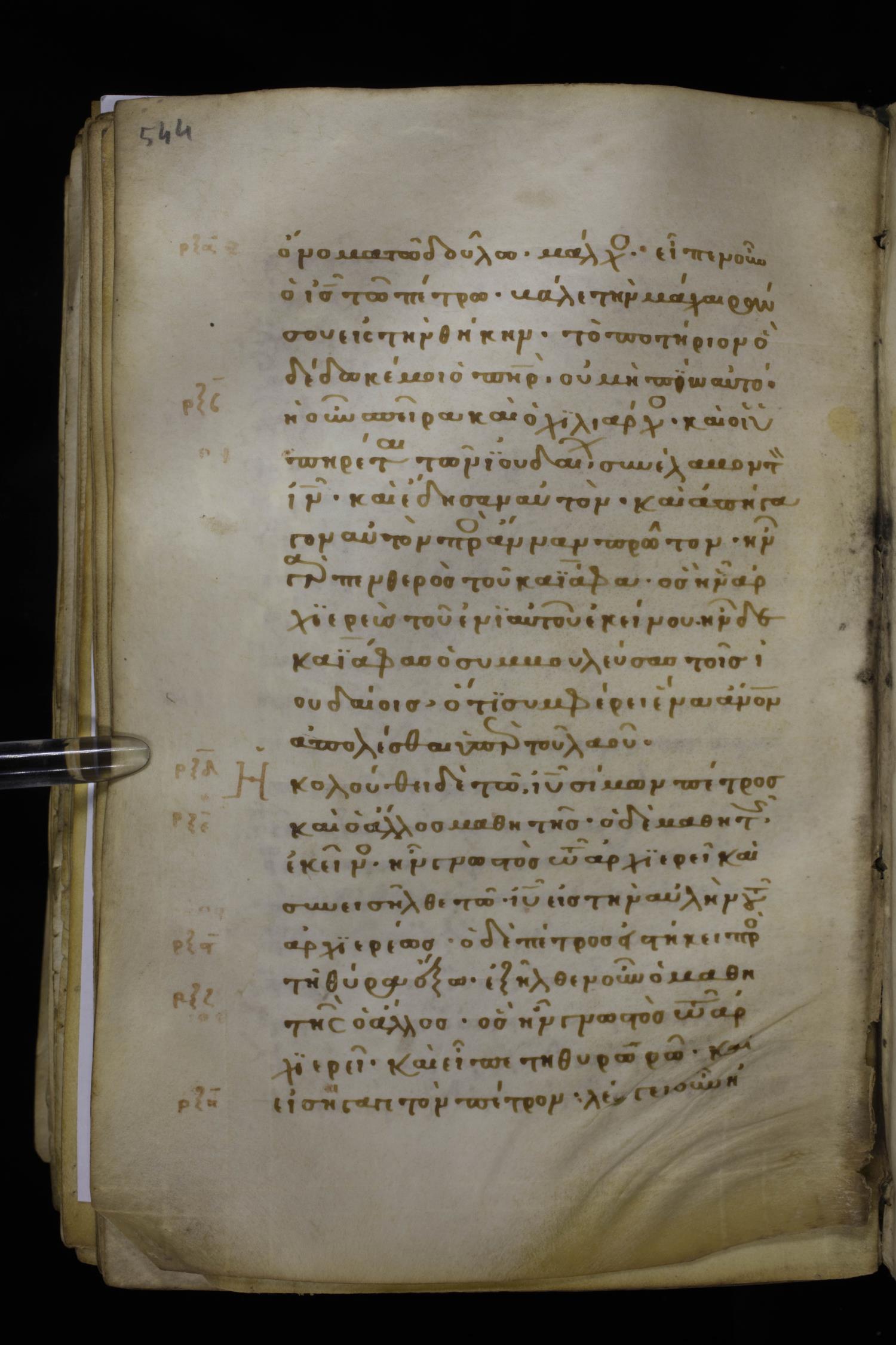 Thirteenth century minuscule of the Gospels on parchment; 298 leaves, 1 column, 22-24 lines per column. Images were taken at the National Library of Greece in Athens.