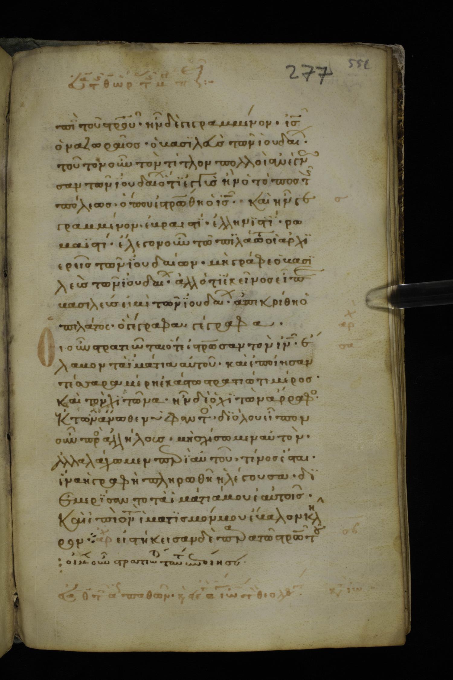 Thirteenth century minuscule of the Gospels on parchment; 298 leaves, 1 column, 22-24 lines per column. Images were taken at the National Library of Greece in Athens.