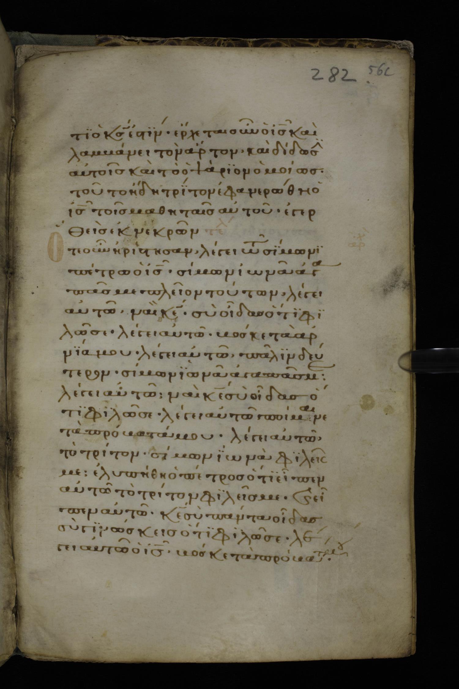 Ὅτε οὖν ἠρίστησαν λέγει τῷ Σίμωνι Πέτρῳ ὁ Ἰησοῦς Σίμων Ἰωάνου / Ἰωάννου, ἀγαπᾷς με πλέον τούτων; λέγει αὐτῷ Ναί, κύριε, σὺ οἶδας ὅτι φιλῶ σε. λέγει αὐτῷ Βόσκε τὰ ἀρνία μου.