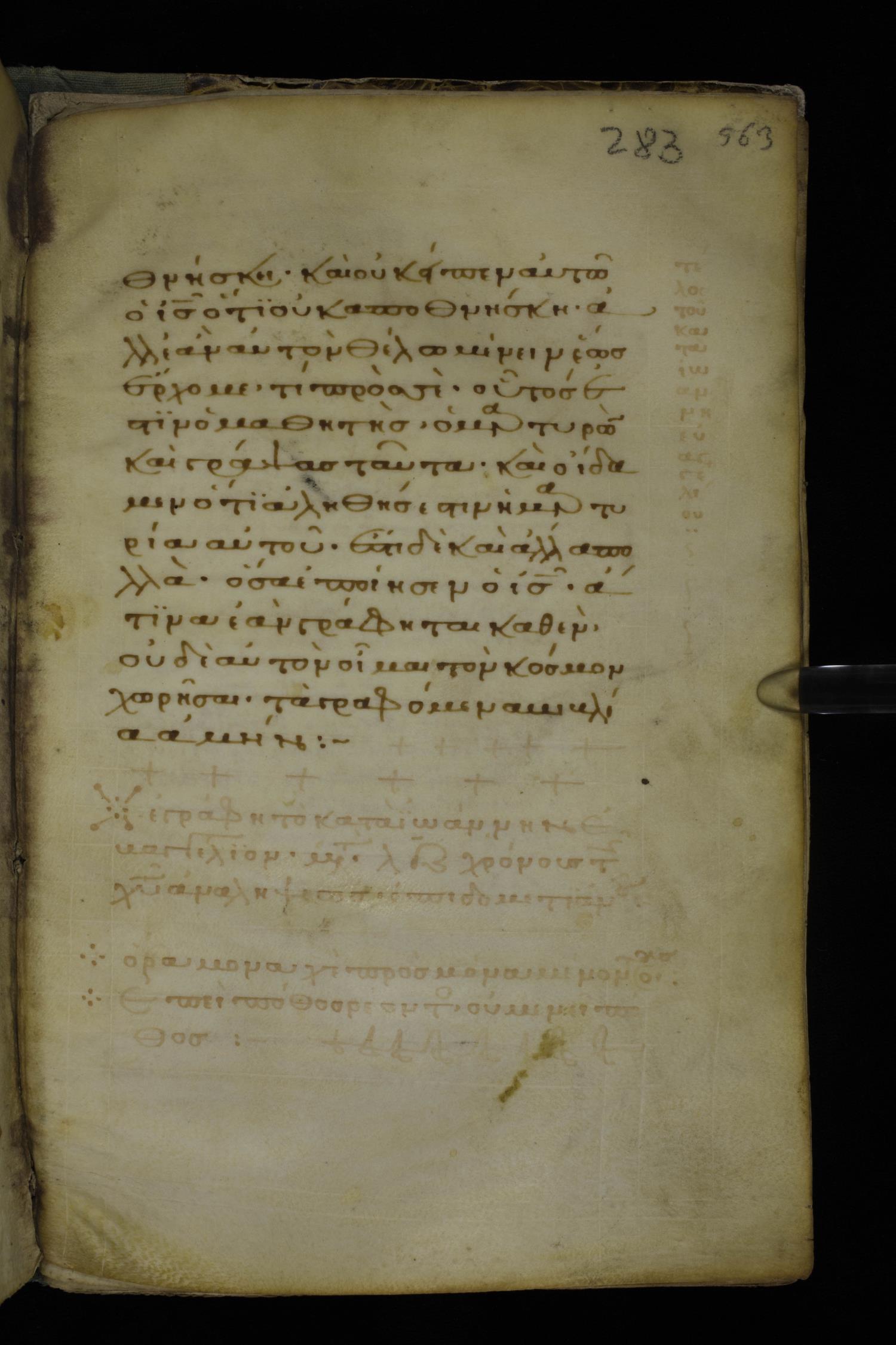 Thirteenth century minuscule of the Gospels on parchment; 298 leaves, 1 column, 22-24 lines per column. Images were taken at the National Library of Greece in Athens.