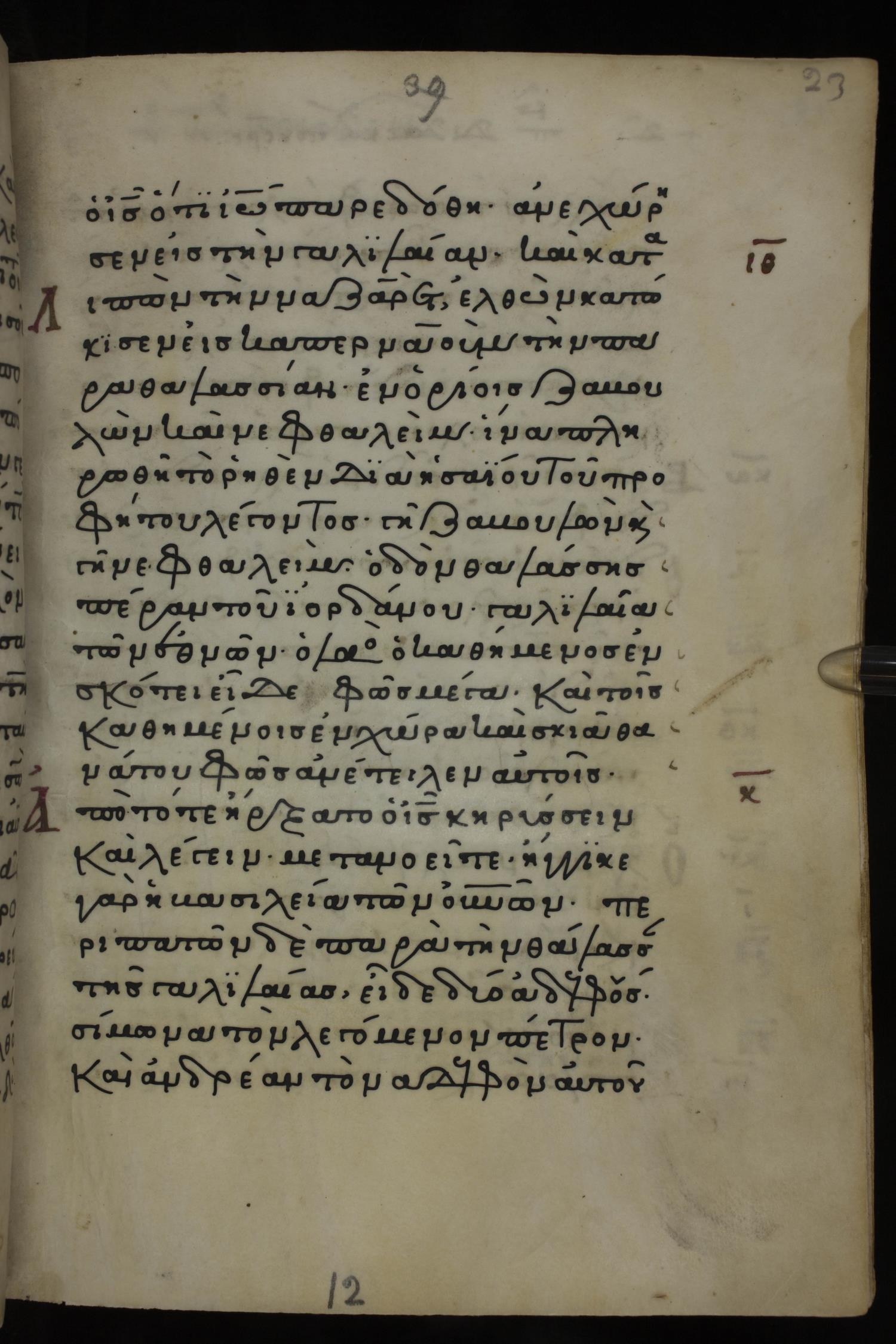 Twelfth century minuscule of the Gospels on parchment; 285 leaves, 1 column, 21-23 lines per column. Images were taken at the National Library of Greece in Athens.