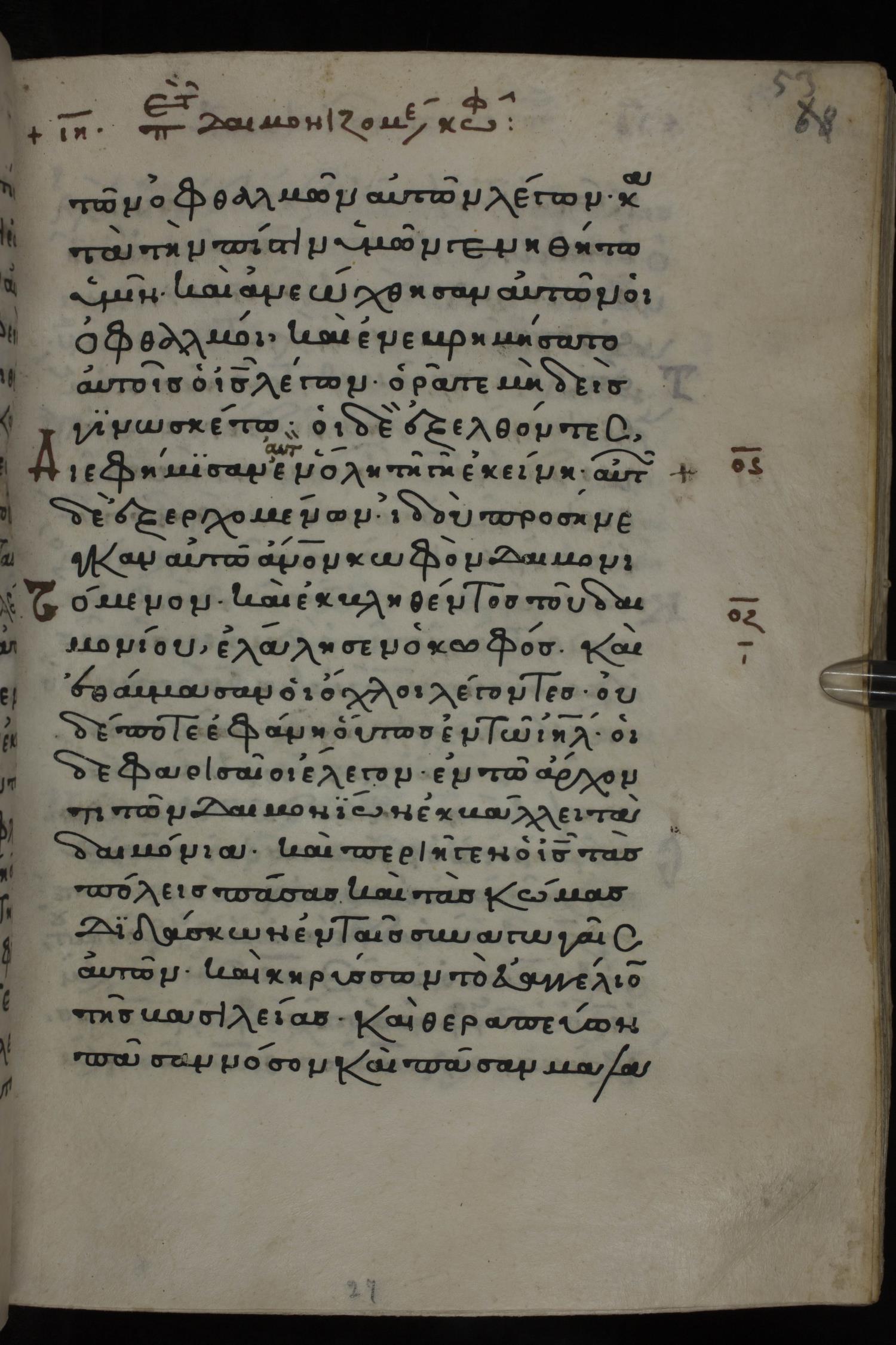 Twelfth century minuscule of the Gospels on parchment; 285 leaves, 1 column, 21-23 lines per column. Images were taken at the National Library of Greece in Athens.