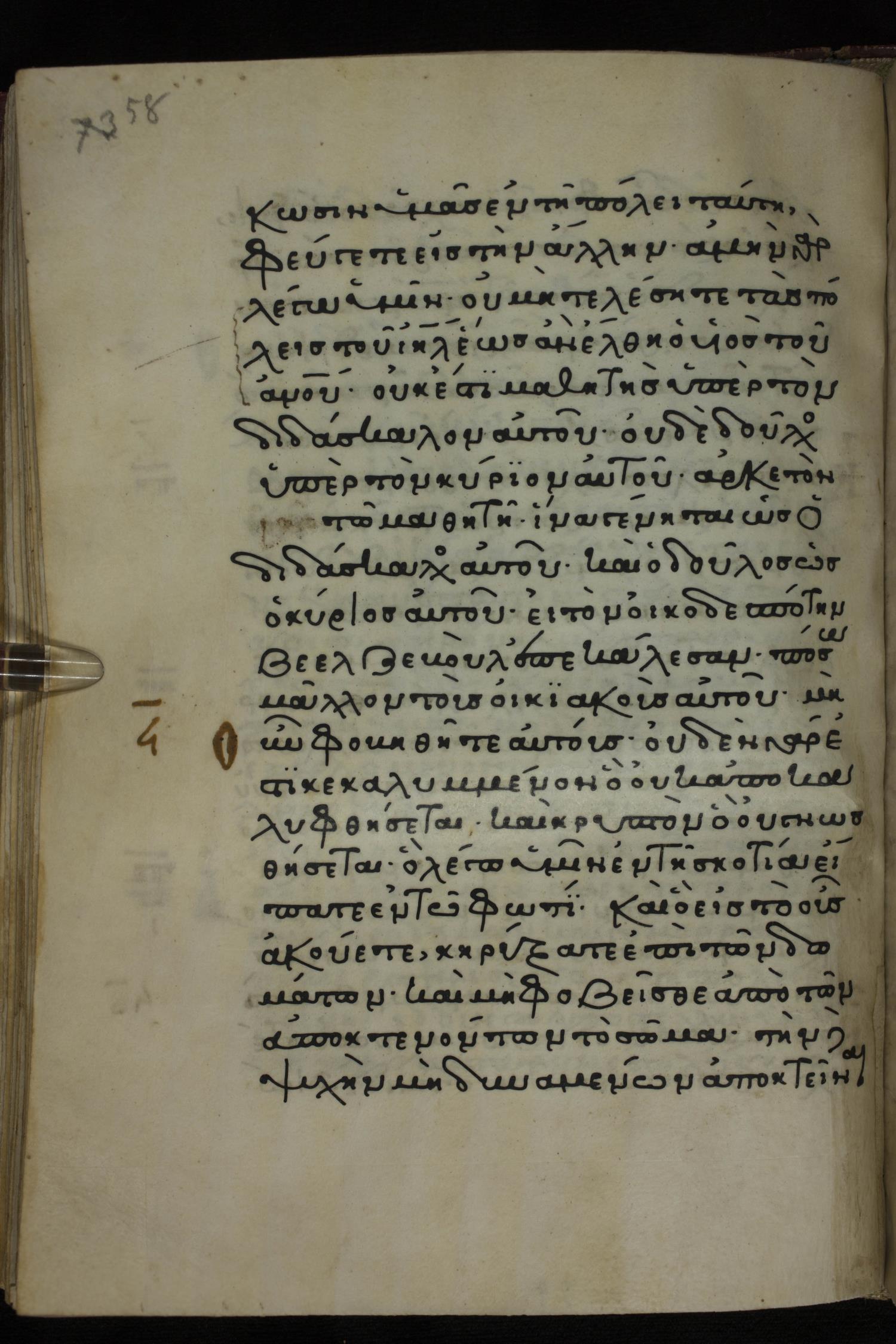 Twelfth century minuscule of the Gospels on parchment; 285 leaves, 1 column, 21-23 lines per column. Images were taken at the National Library of Greece in Athens.