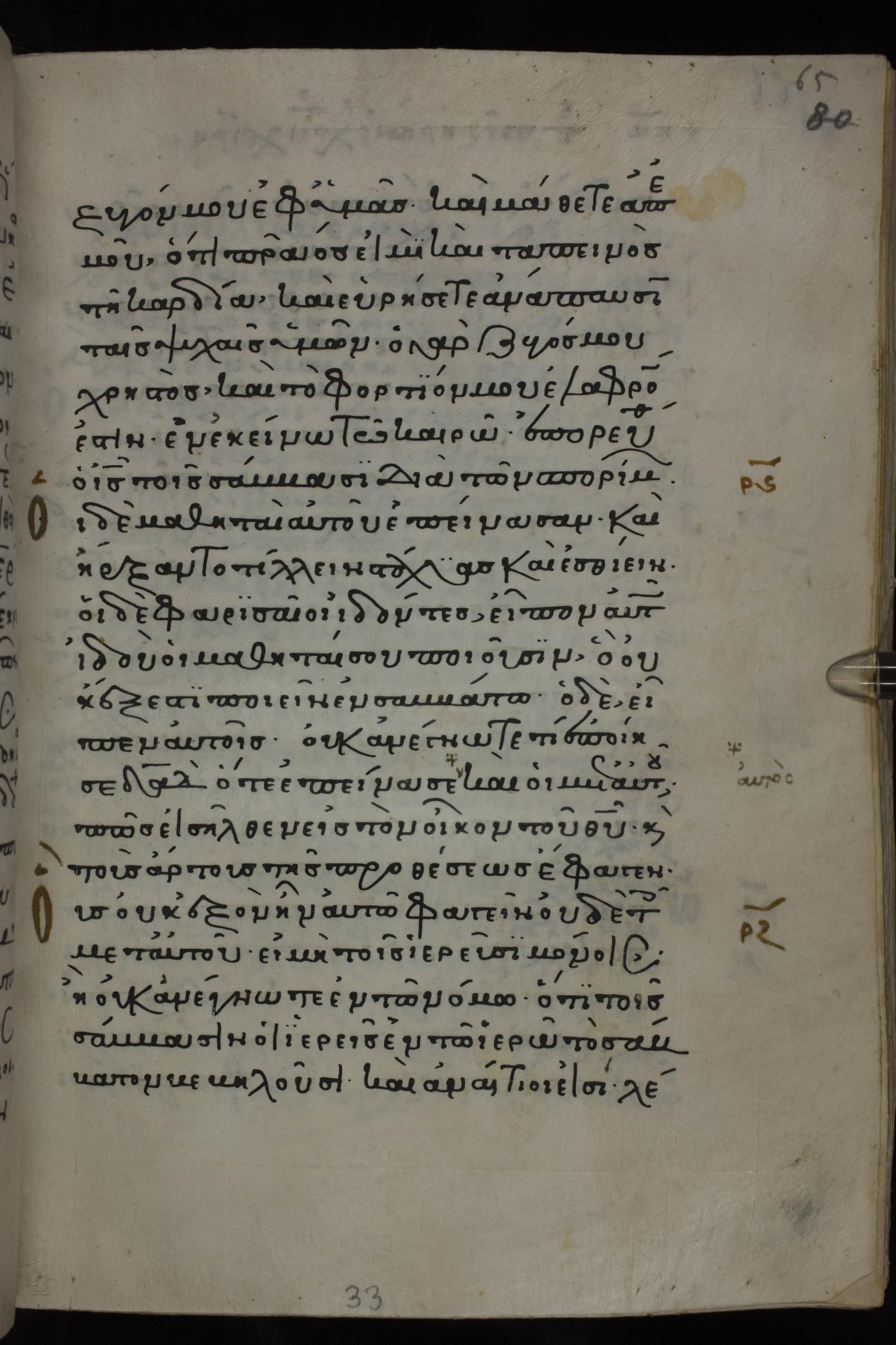 Twelfth century minuscule of the Gospels on parchment; 285 leaves, 1 column, 21-23 lines per column. Images were taken at the National Library of Greece in Athens.