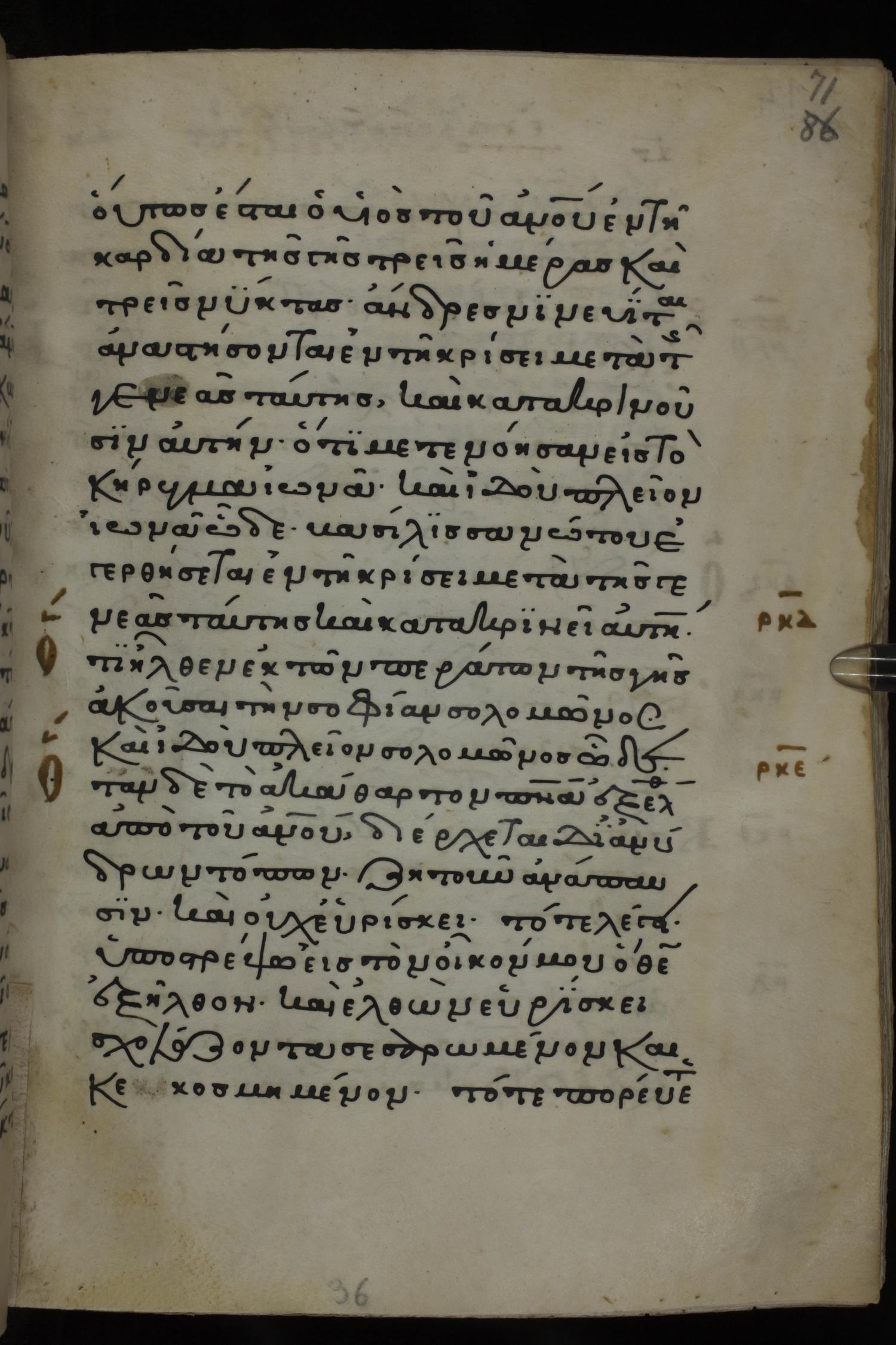 Twelfth century minuscule of the Gospels on parchment; 285 leaves, 1 column, 21-23 lines per column. Images were taken at the National Library of Greece in Athens.