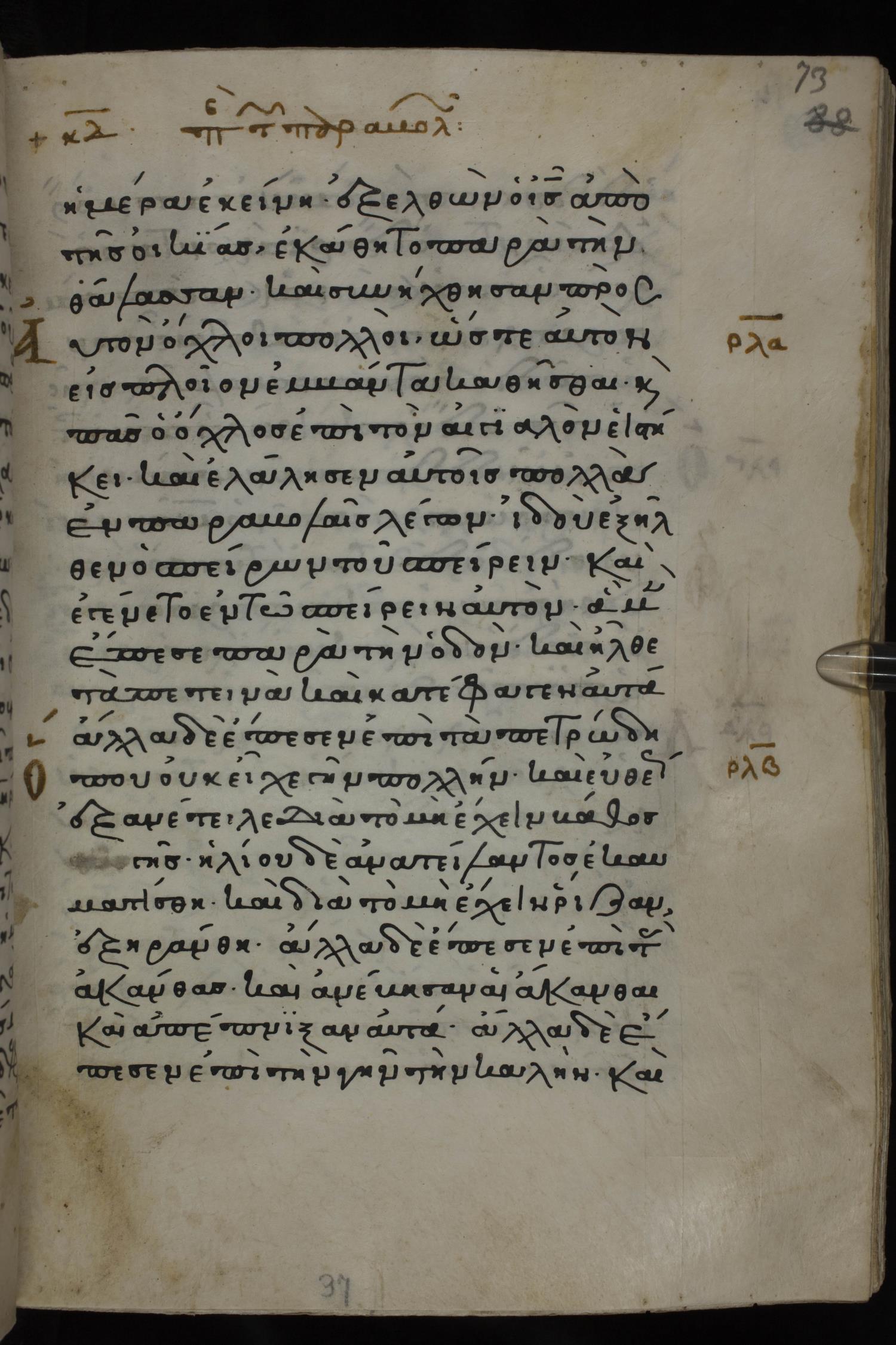 Twelfth century minuscule of the Gospels on parchment; 285 leaves, 1 column, 21-23 lines per column. Images were taken at the National Library of Greece in Athens.