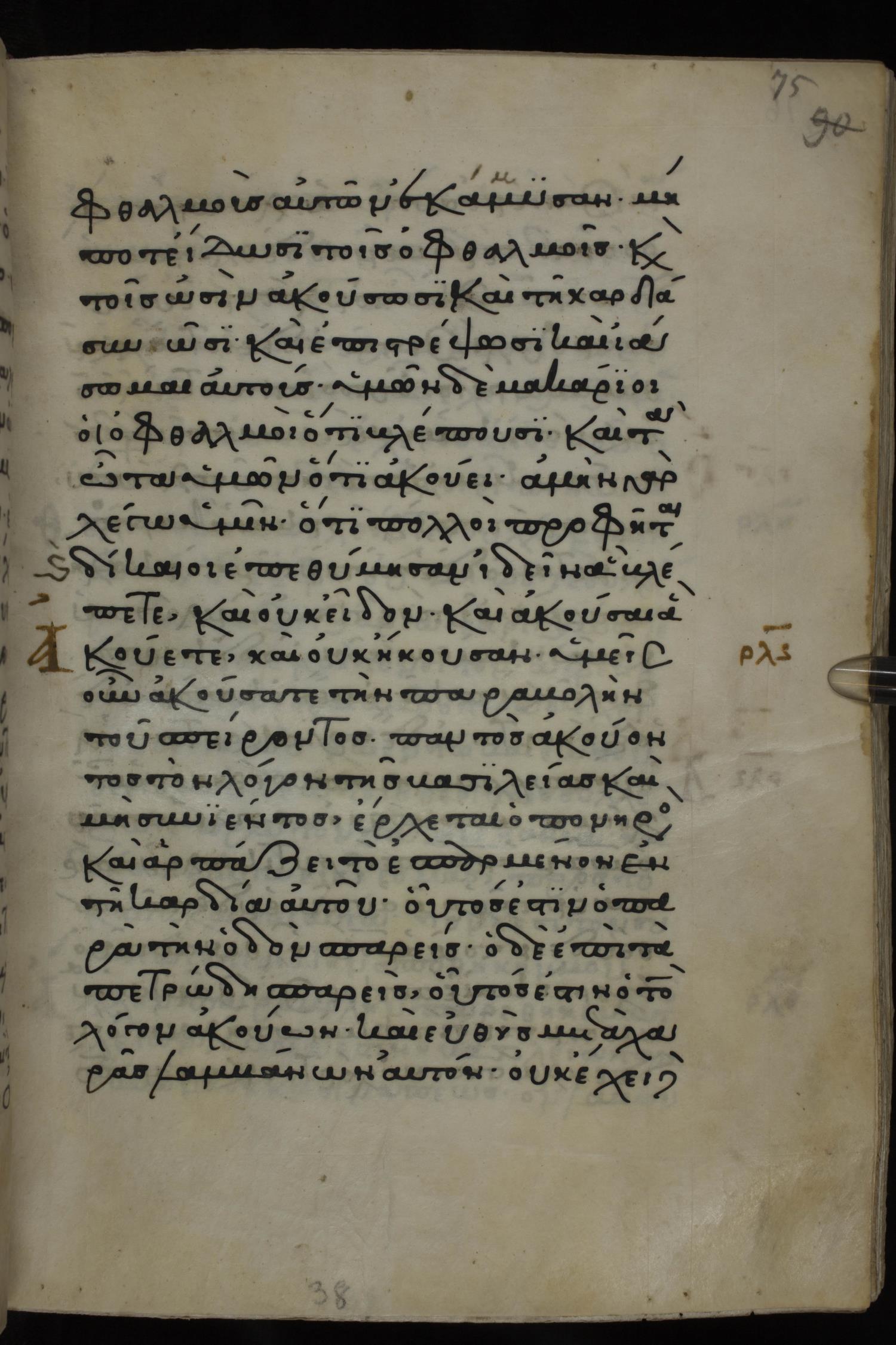 Twelfth century minuscule of the Gospels on parchment; 285 leaves, 1 column, 21-23 lines per column. Images were taken at the National Library of Greece in Athens.