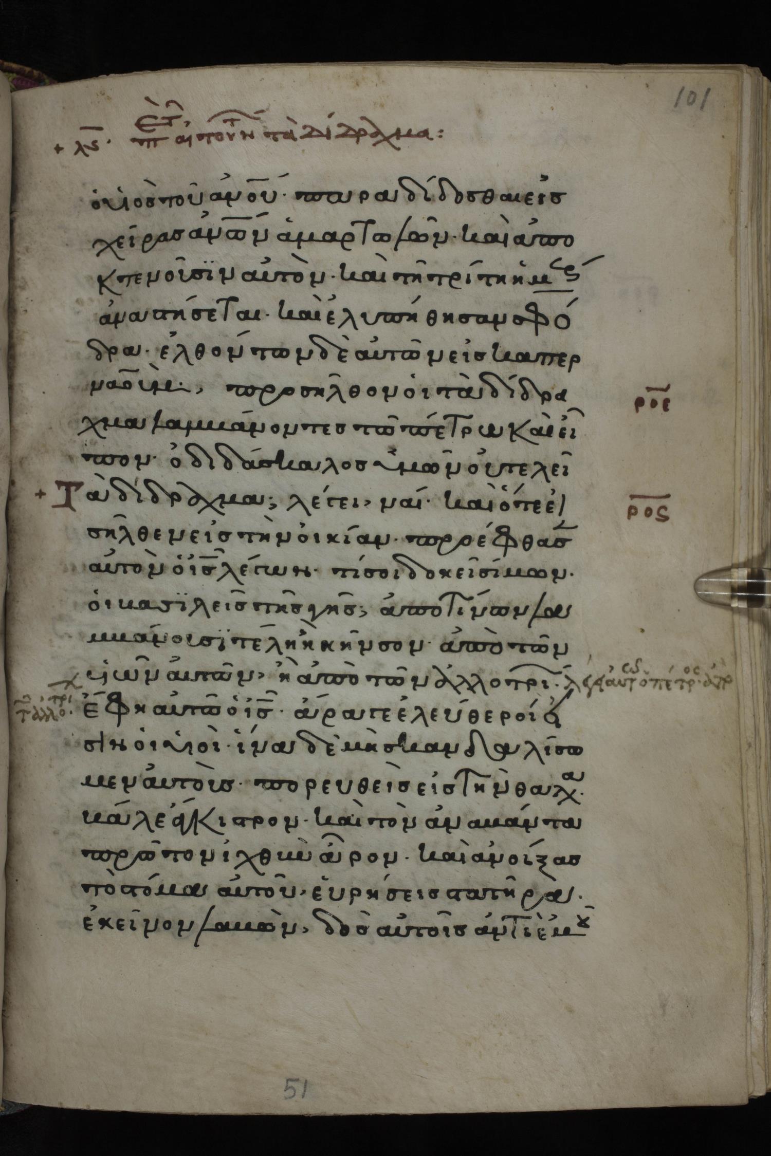 Twelfth century minuscule of the Gospels on parchment; 285 leaves, 1 column, 21-23 lines per column. Images were taken at the National Library of Greece in Athens.