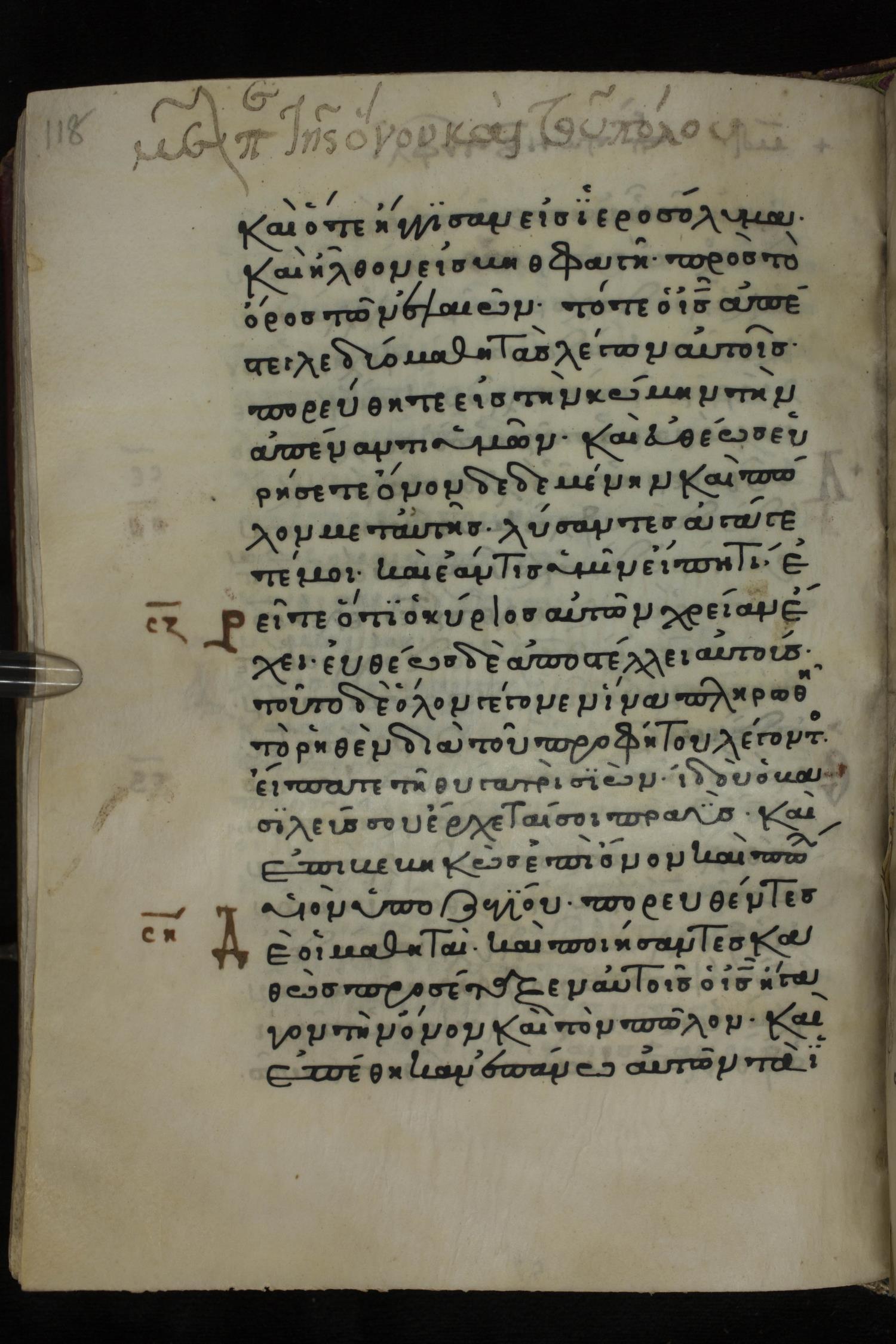 Twelfth century minuscule of the Gospels on parchment; 285 leaves, 1 column, 21-23 lines per column. Images were taken at the National Library of Greece in Athens.