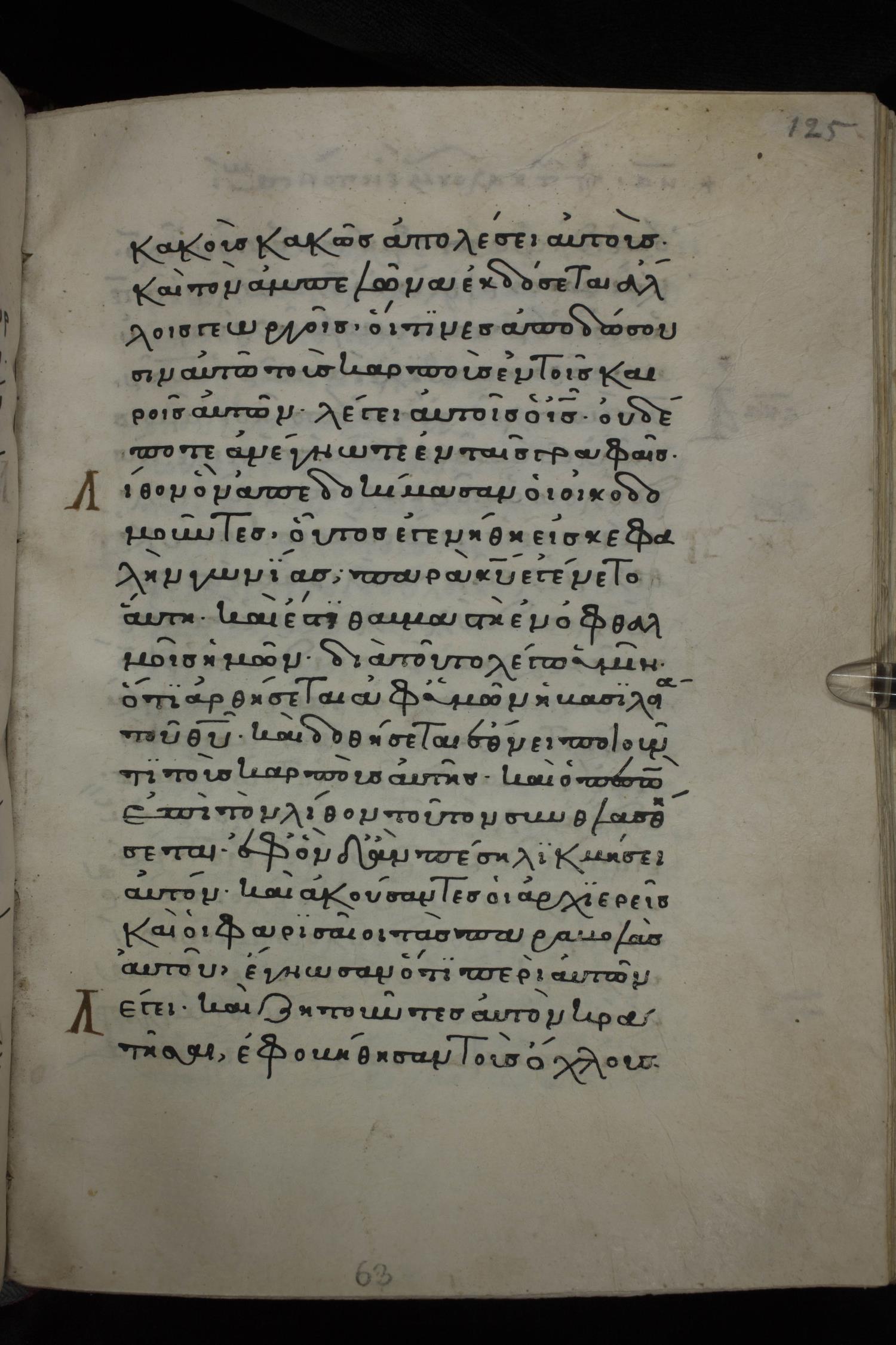 Twelfth century minuscule of the Gospels on parchment; 285 leaves, 1 column, 21-23 lines per column. Images were taken at the National Library of Greece in Athens.