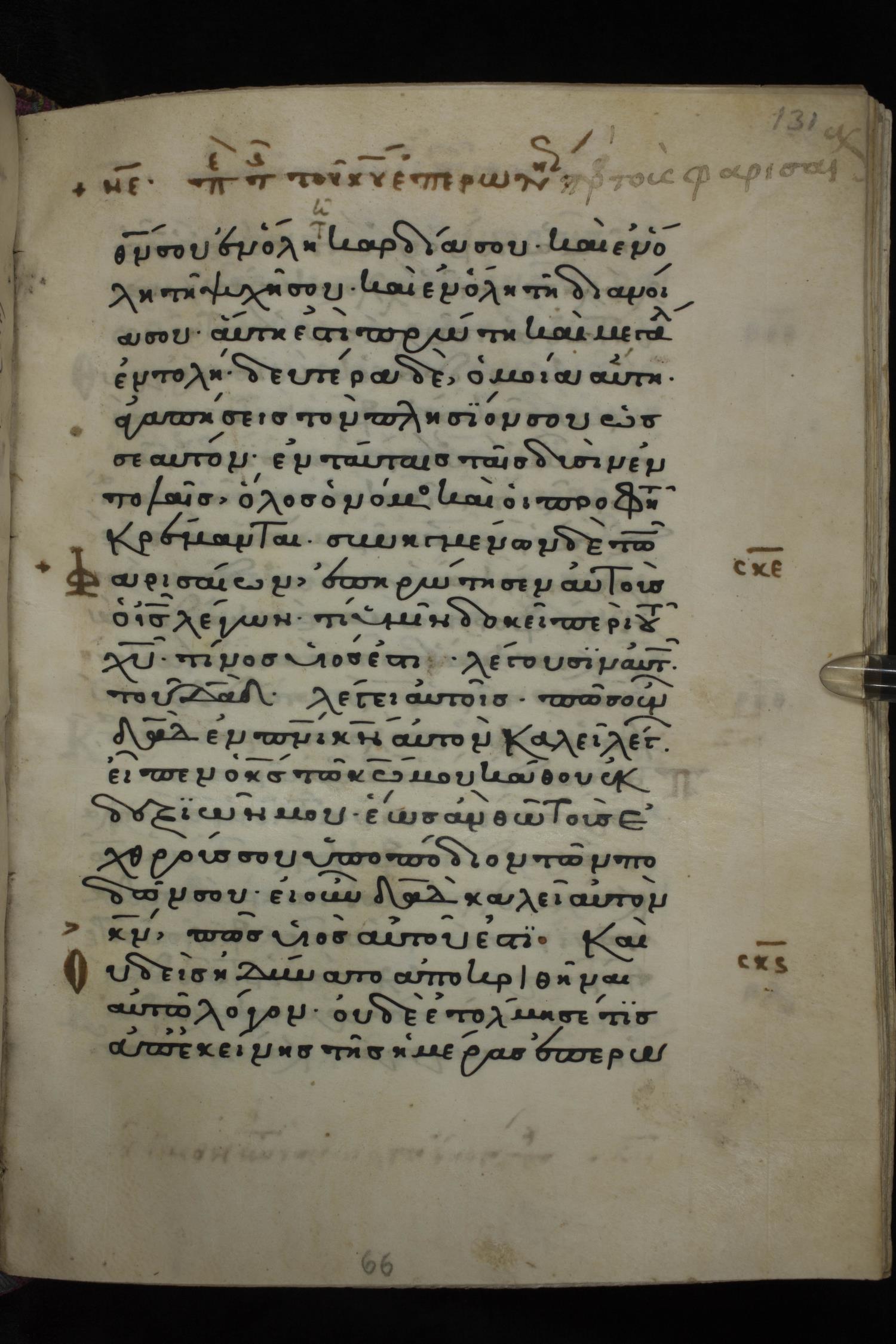 Twelfth century minuscule of the Gospels on parchment; 285 leaves, 1 column, 21-23 lines per column. Images were taken at the National Library of Greece in Athens.