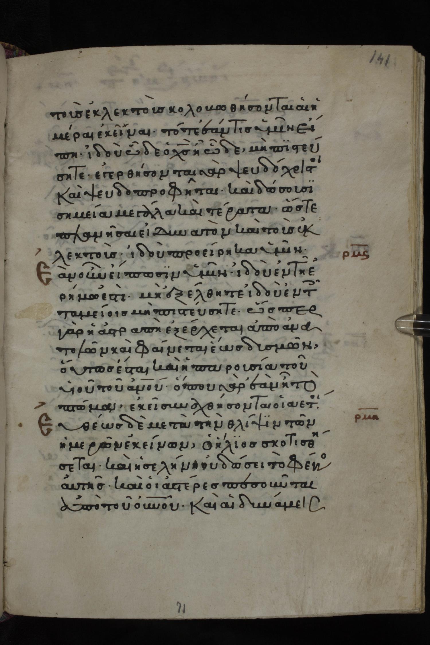 Twelfth century minuscule of the Gospels on parchment; 285 leaves, 1 column, 21-23 lines per column. Images were taken at the National Library of Greece in Athens.