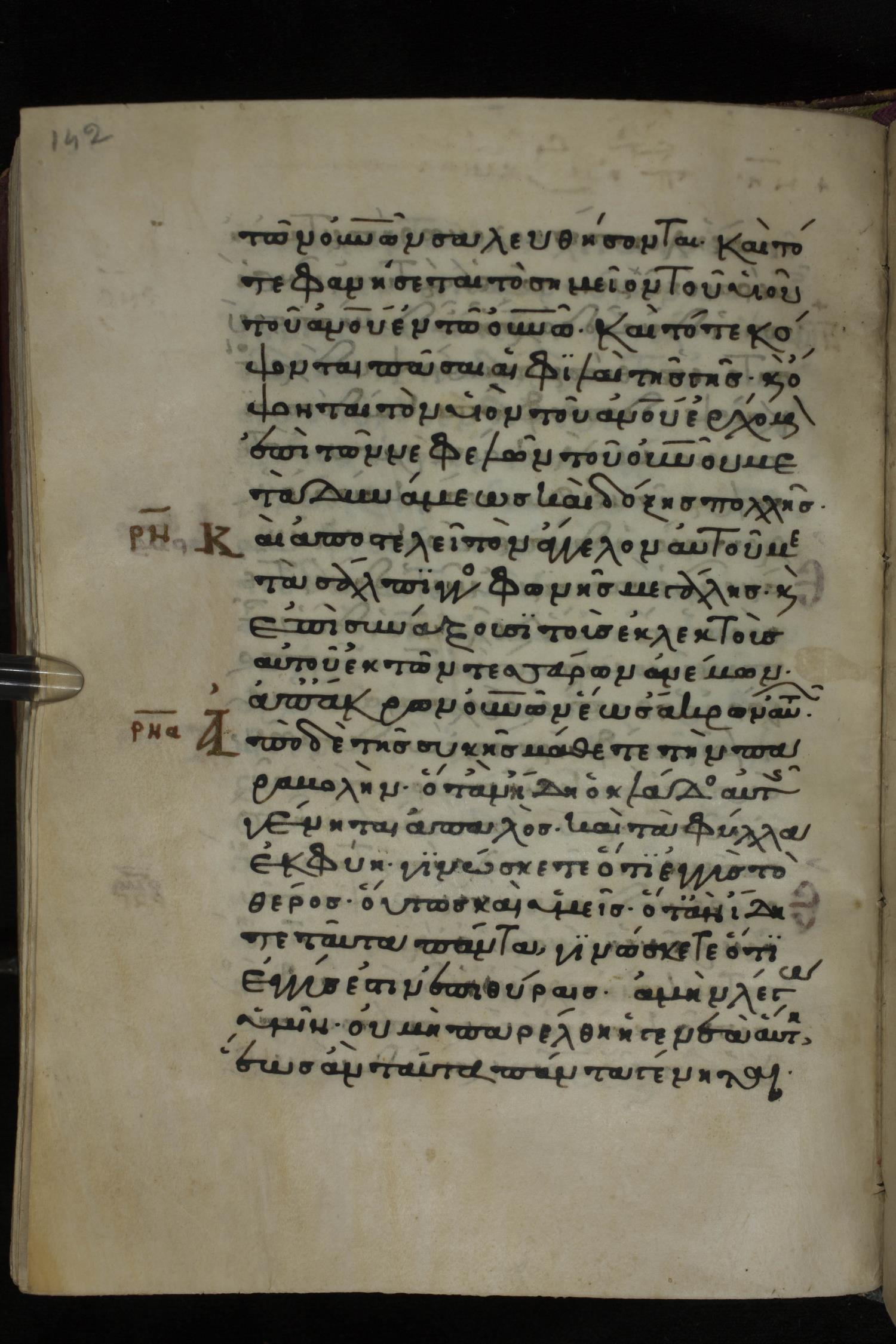 Twelfth century minuscule of the Gospels on parchment; 285 leaves, 1 column, 21-23 lines per column. Images were taken at the National Library of Greece in Athens.