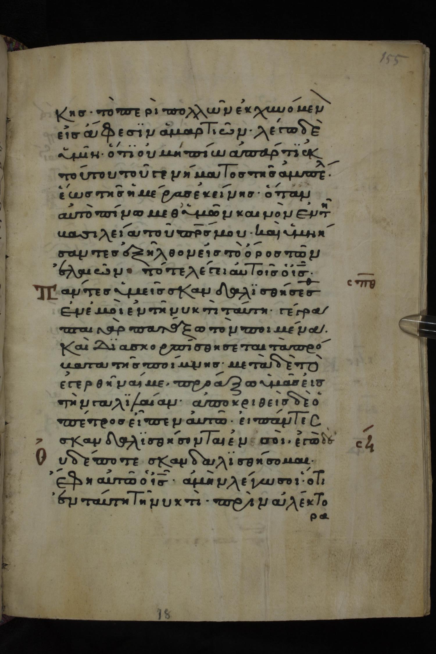 Twelfth century minuscule of the Gospels on parchment; 285 leaves, 1 column, 21-23 lines per column. Images were taken at the National Library of Greece in Athens.