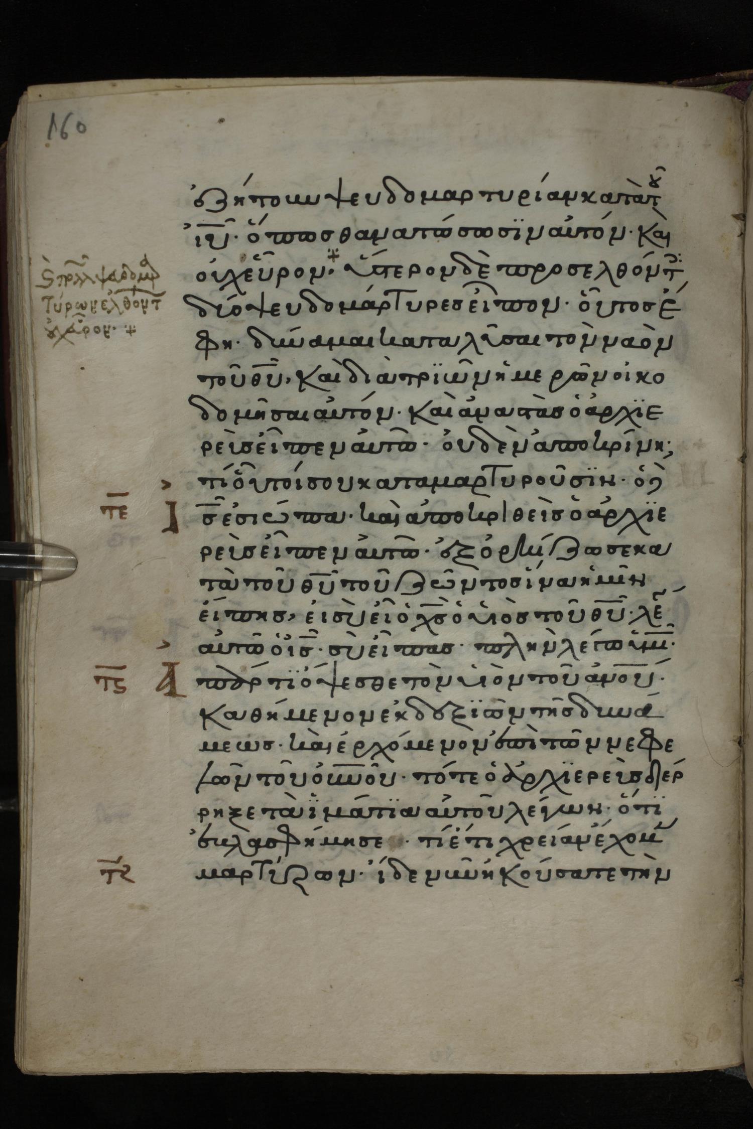 Twelfth century minuscule of the Gospels on parchment; 285 leaves, 1 column, 21-23 lines per column. Images were taken at the National Library of Greece in Athens.