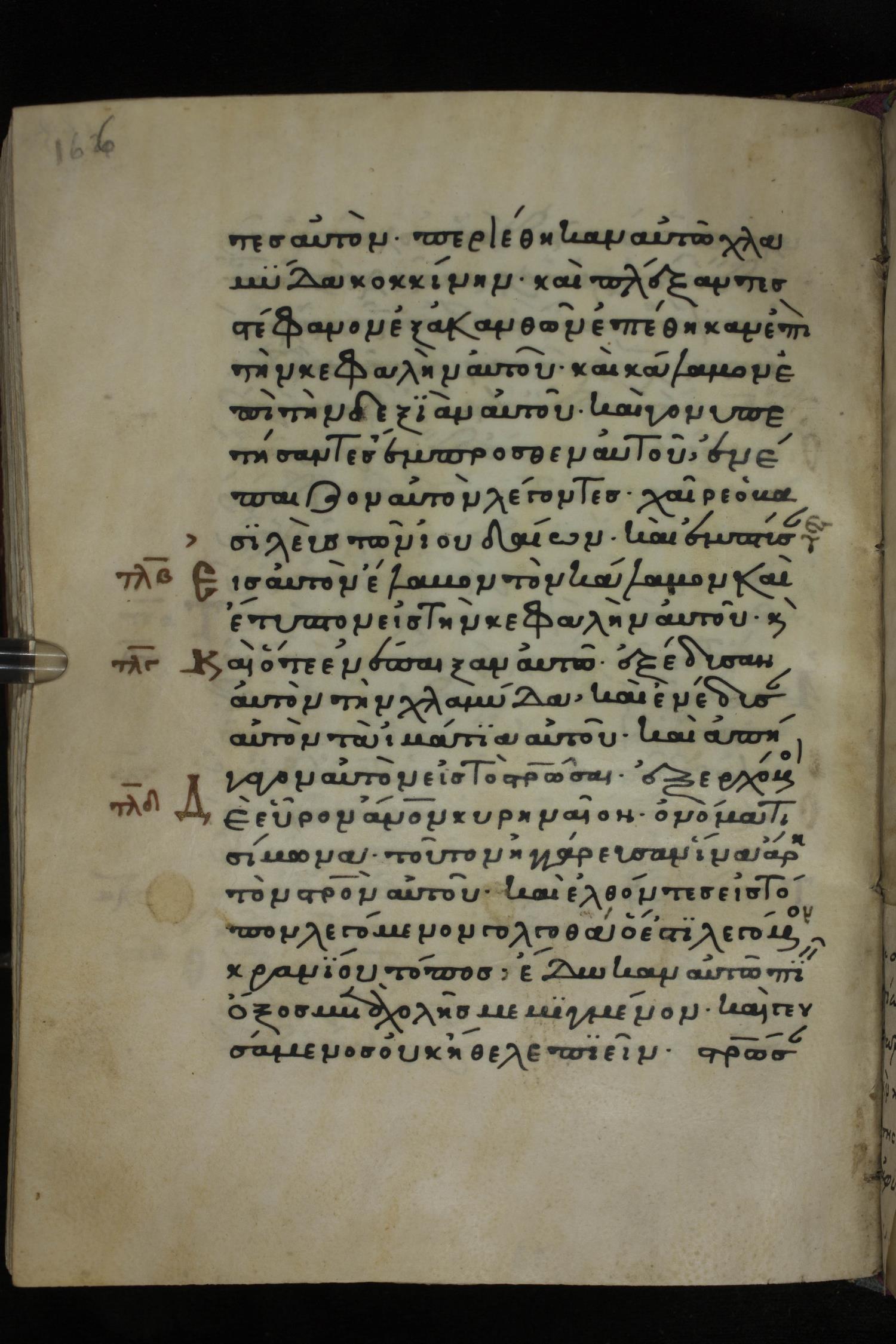 Twelfth century minuscule of the Gospels on parchment; 285 leaves, 1 column, 21-23 lines per column. Images were taken at the National Library of Greece in Athens.