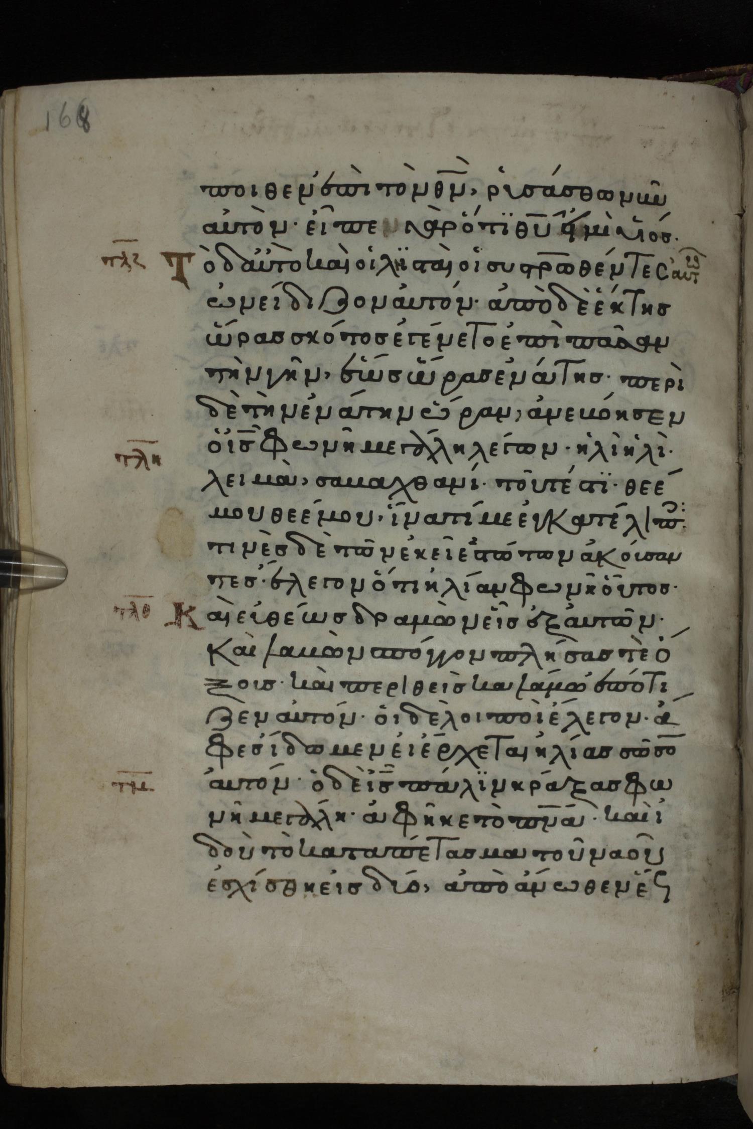 Twelfth century minuscule of the Gospels on parchment; 285 leaves, 1 column, 21-23 lines per column. Images were taken at the National Library of Greece in Athens.