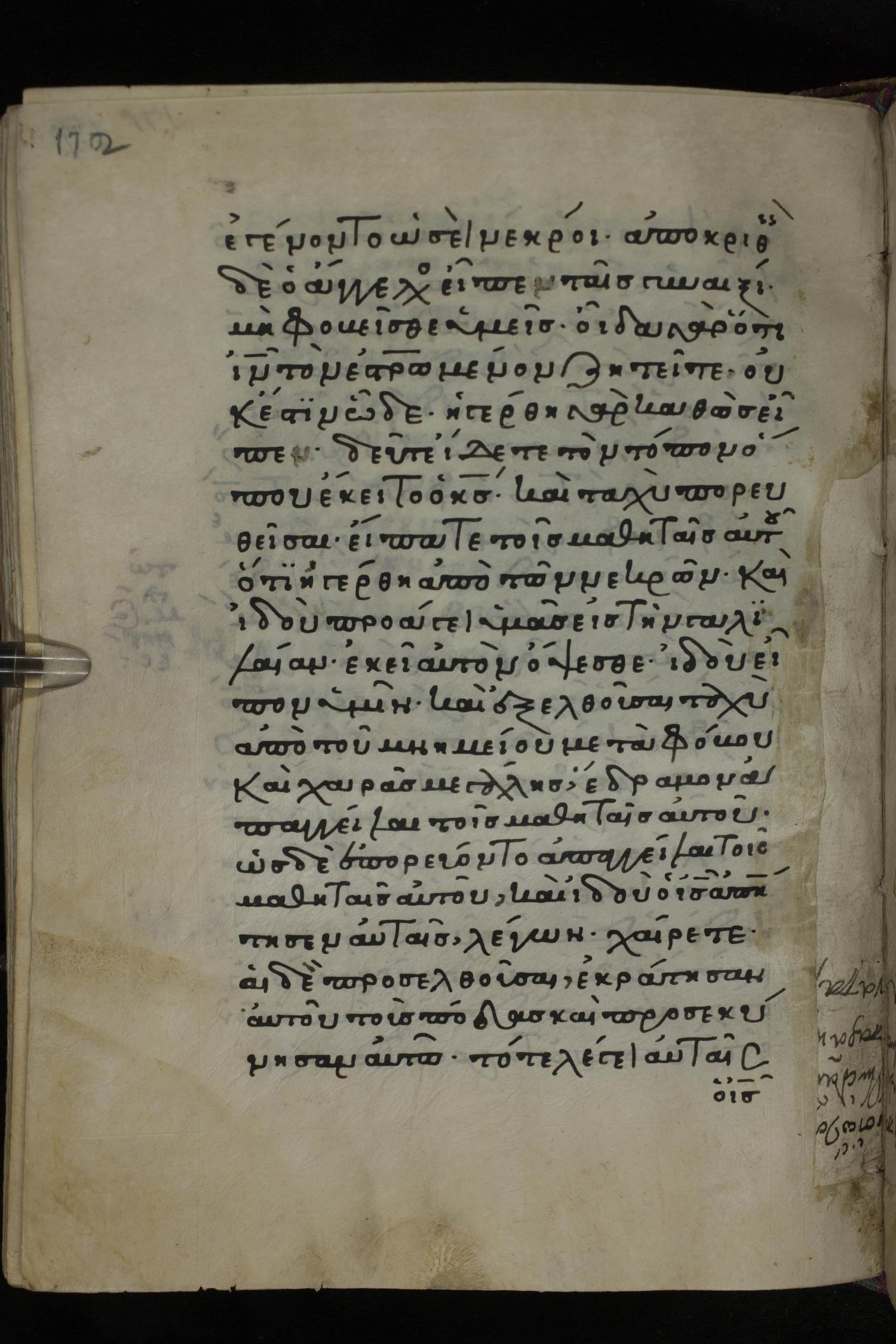 Twelfth century minuscule of the Gospels on parchment; 285 leaves, 1 column, 21-23 lines per column. Images were taken at the National Library of Greece in Athens.