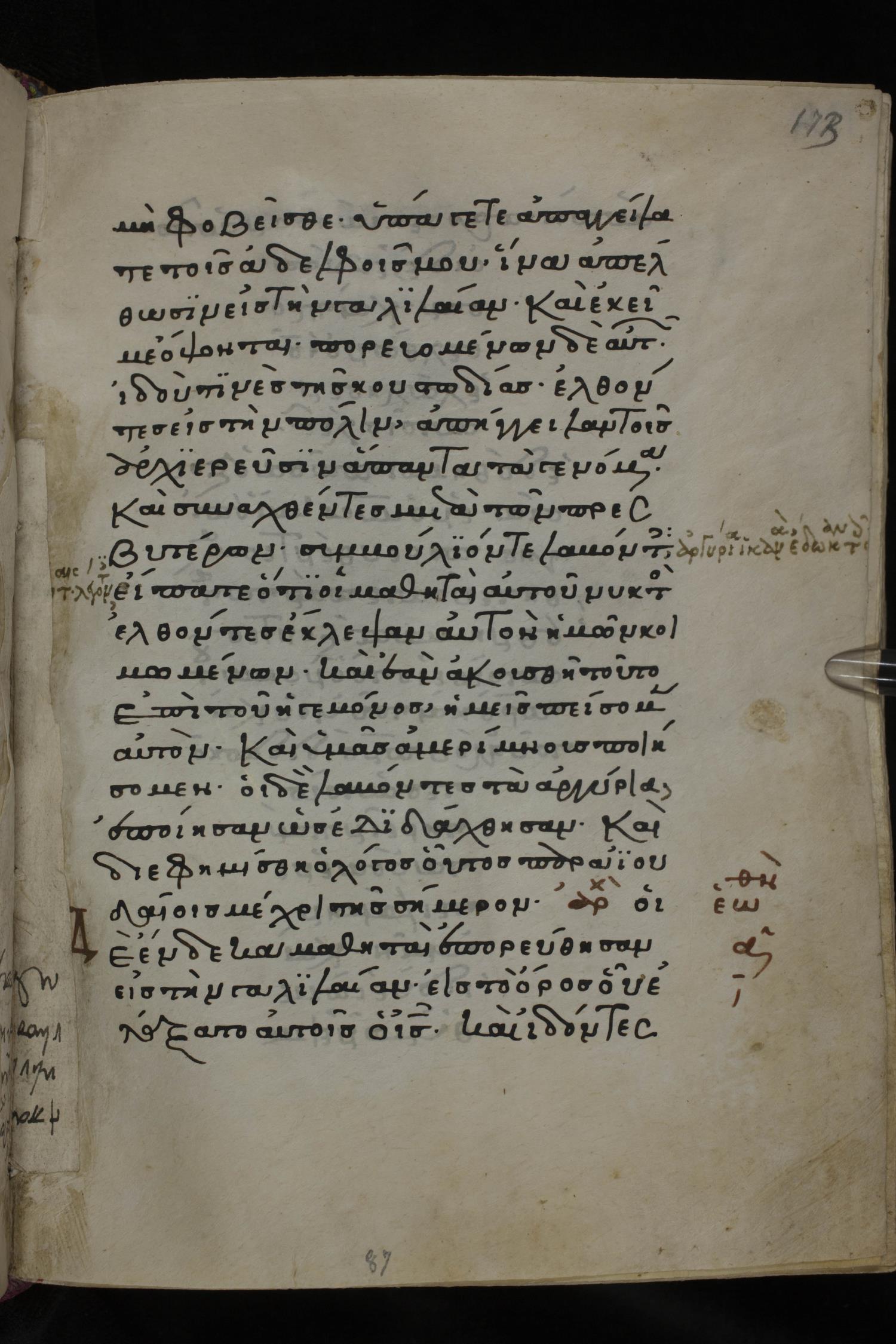Twelfth century minuscule of the Gospels on parchment; 285 leaves, 1 column, 21-23 lines per column. Images were taken at the National Library of Greece in Athens.