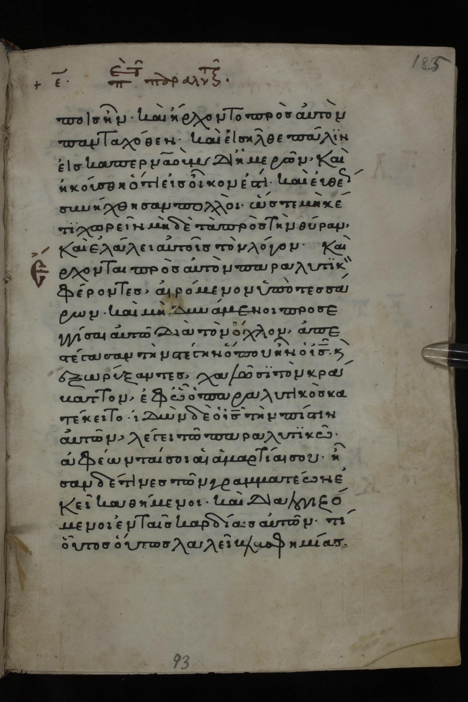 Twelfth century minuscule of the Gospels on parchment; 285 leaves, 1 column, 21-23 lines per column. Images were taken at the National Library of Greece in Athens.