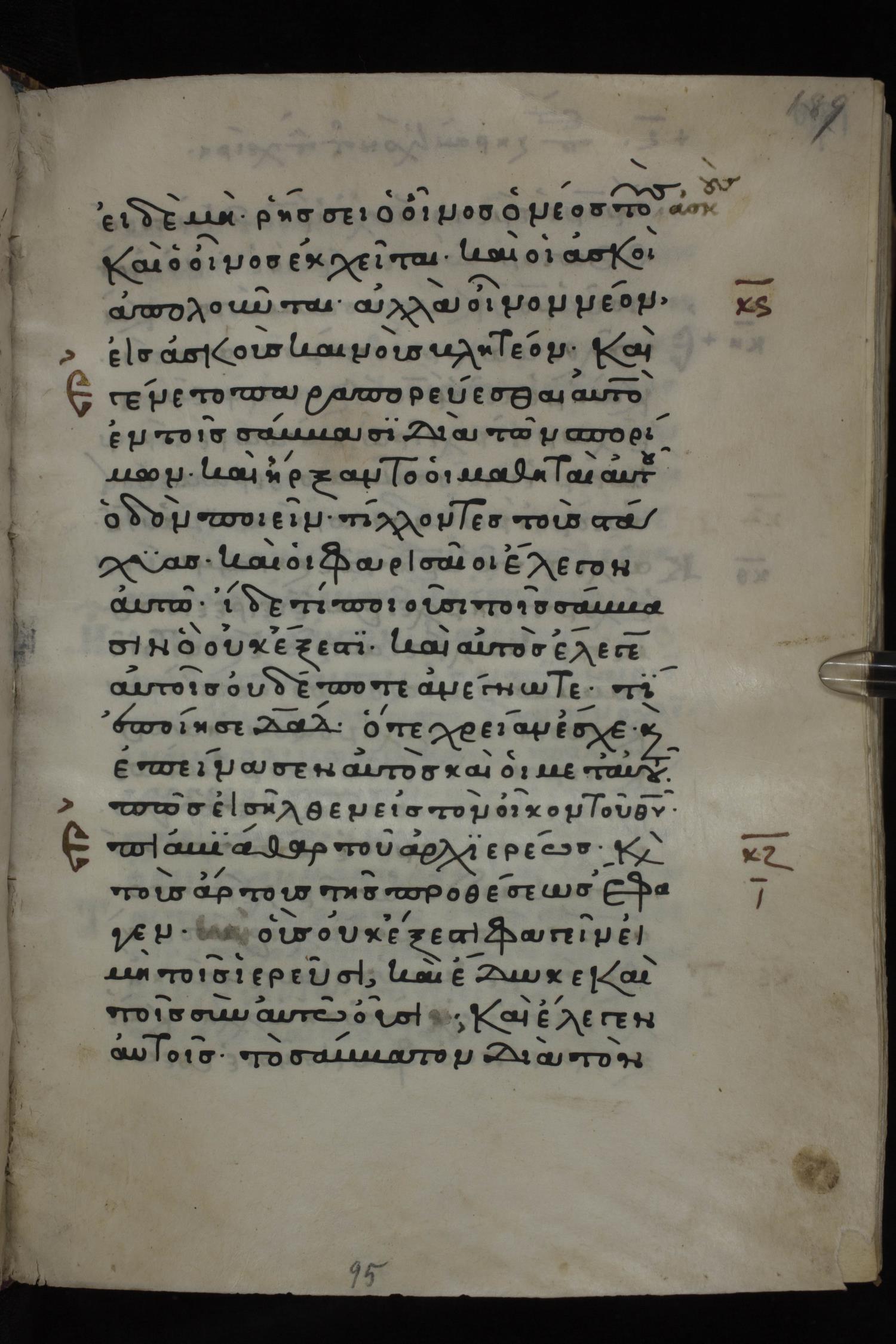 Twelfth century minuscule of the Gospels on parchment; 285 leaves, 1 column, 21-23 lines per column. Images were taken at the National Library of Greece in Athens.