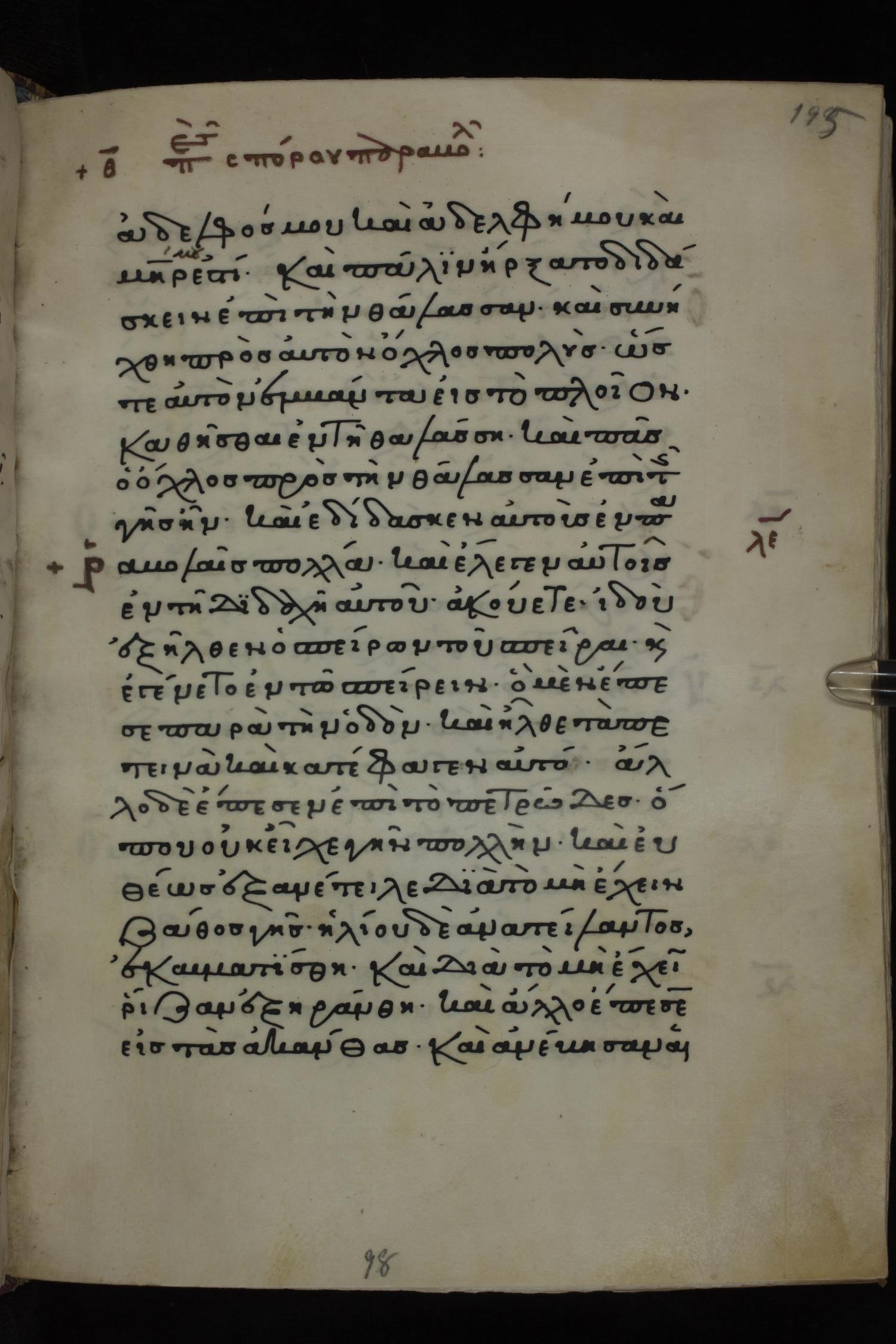 Twelfth century minuscule of the Gospels on parchment; 285 leaves, 1 column, 21-23 lines per column. Images were taken at the National Library of Greece in Athens.