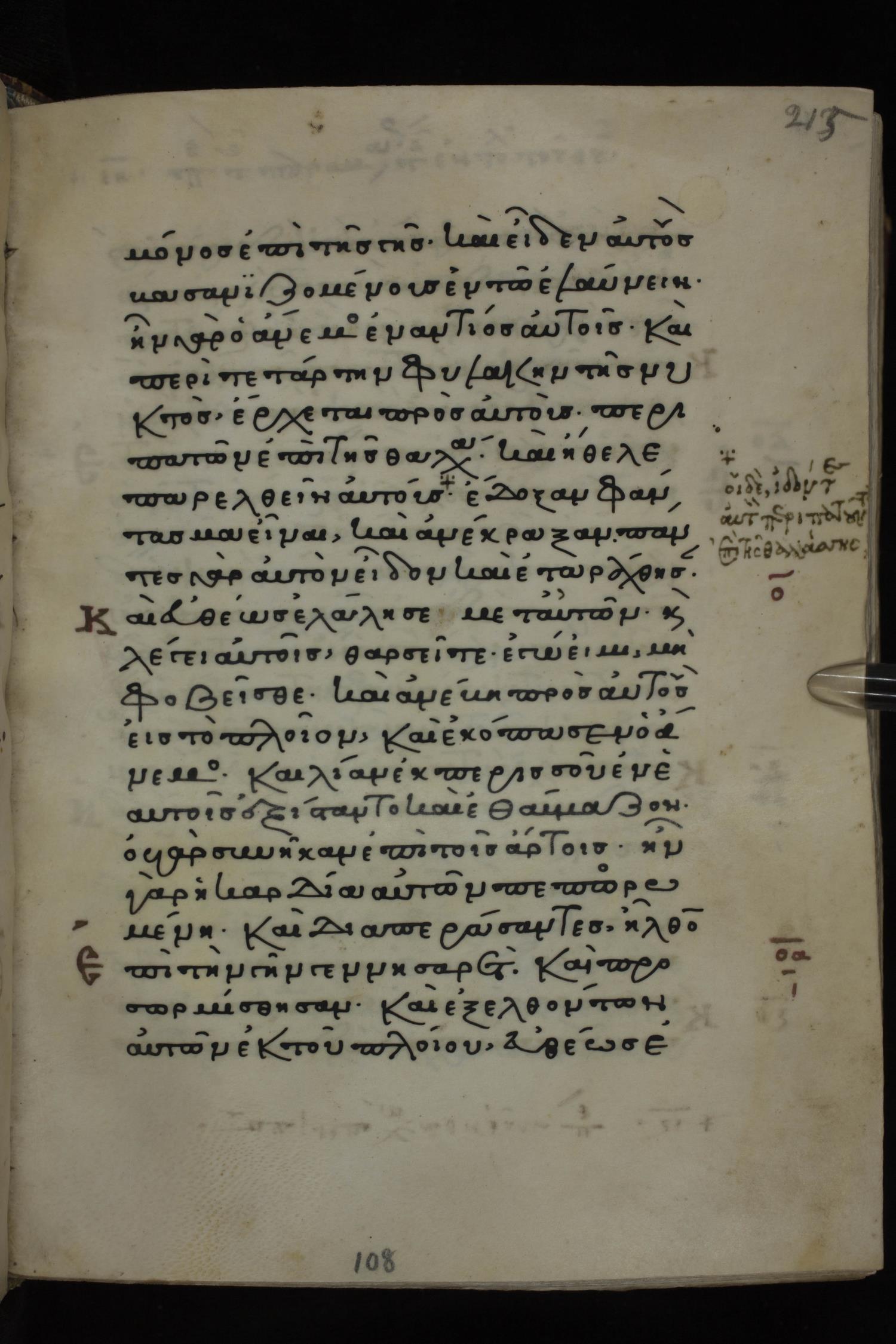 Twelfth century minuscule of the Gospels on parchment; 285 leaves, 1 column, 21-23 lines per column. Images were taken at the National Library of Greece in Athens.